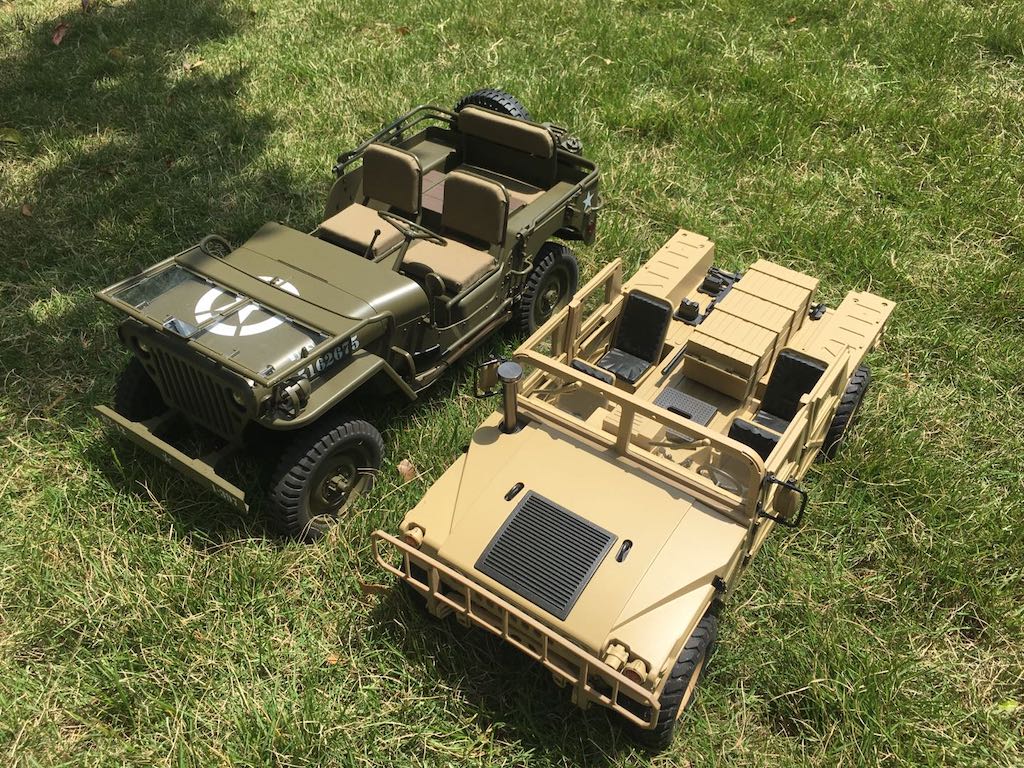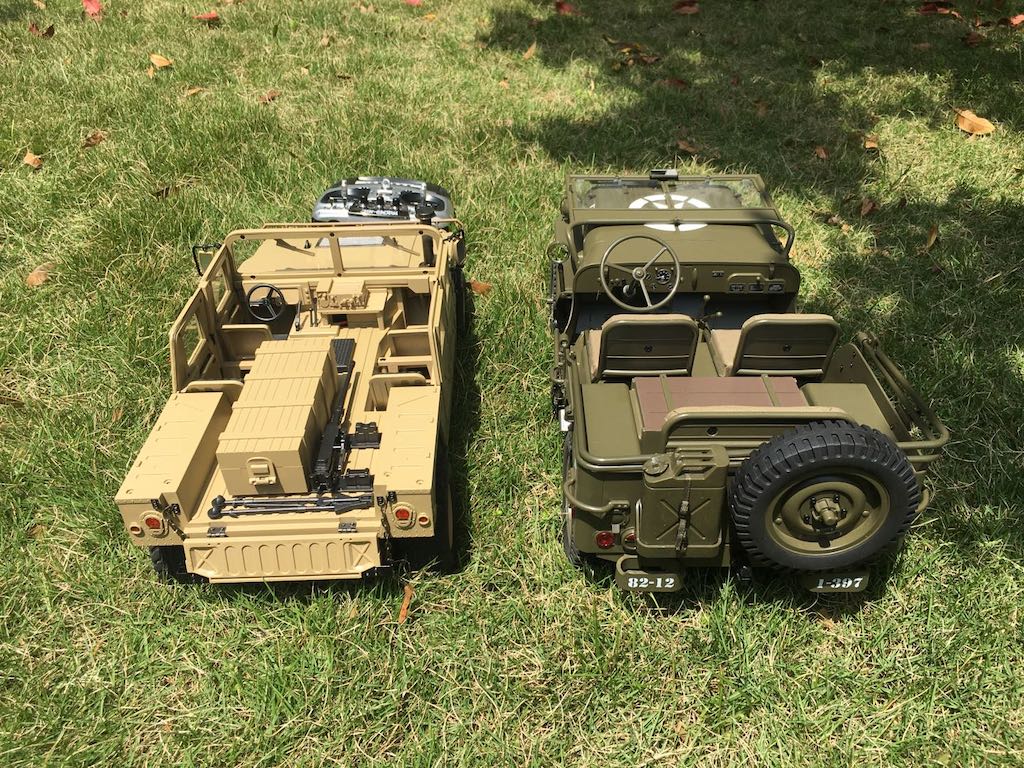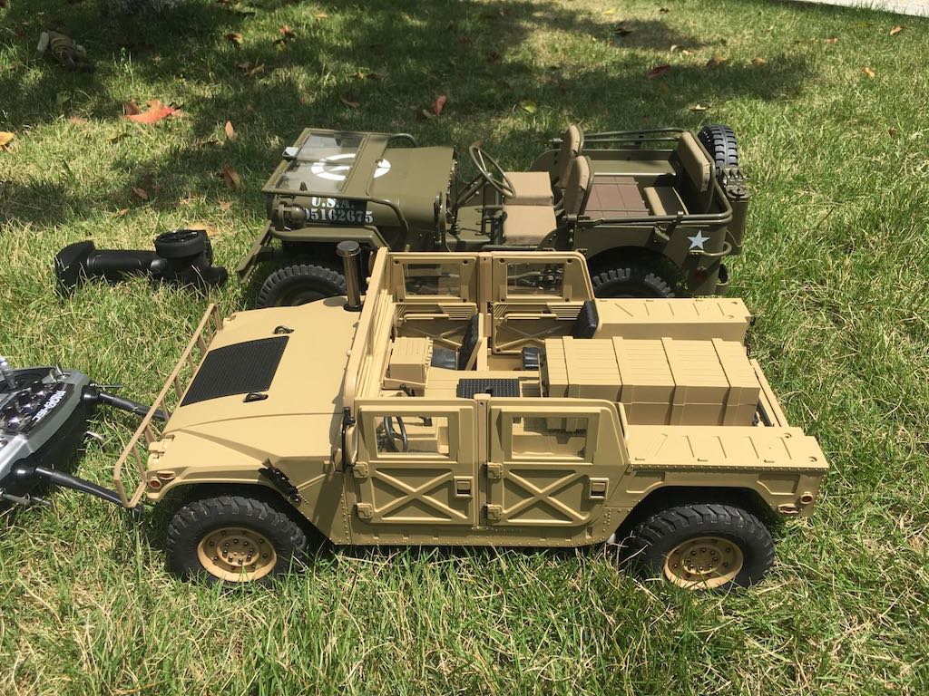 Since I was solo, I didn't get a chance to take any video but here are some shots alongside the Hummer for comparison. Again, with all the metal parts HG uses as standard, my Hummer weighs twice as much as the MB. In case anyone is wondering, I lifted up the driver's side of the body to straighten up for the shots due to the soft springs. The Hummer's suspension, on the other hand, is rock solid but a completely different design with shocks designed to carry the weight. HG certainly makes a very nice product! :thumbup:
