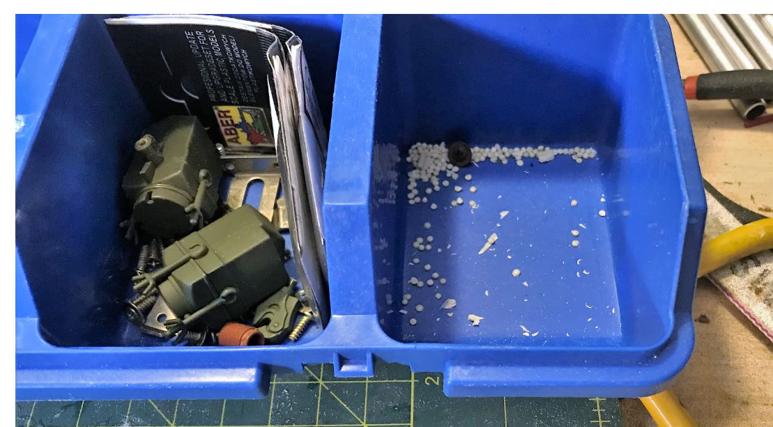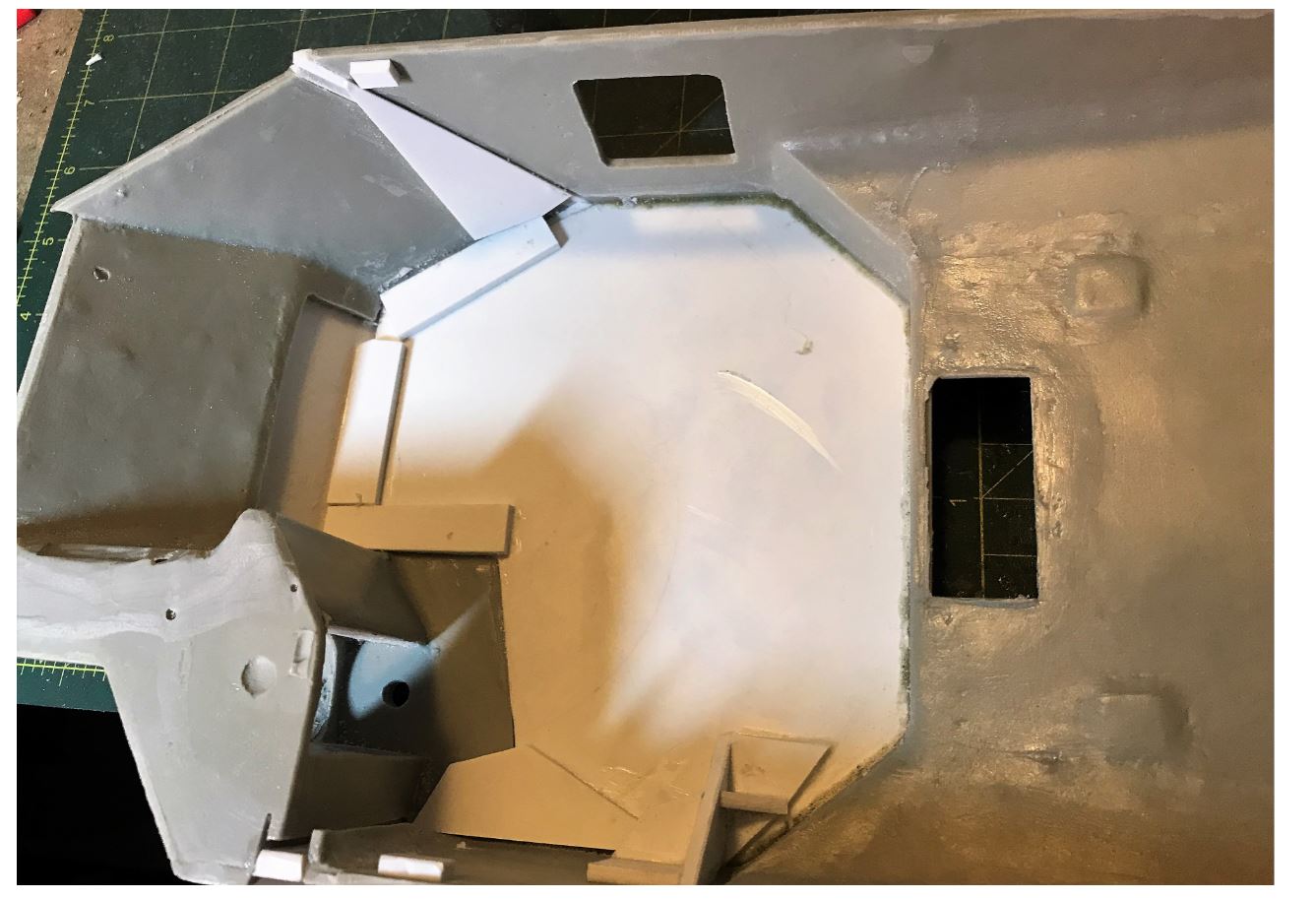 The upper hull is cut open with a heavy disk blade on the Dremel. The whole operation was cutting through and burning resin with heavy fumes. All the cutting need to be done outside and in a light breeze. All the plastic and resin sanding for this work is done wearing an N95 mask, an absolute must to preserve lungs and health.