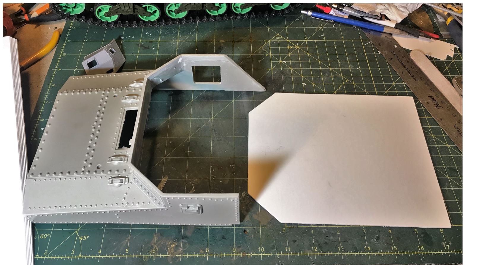 The angle of the armored plate for the gun mount is carefully calculated, cut off with the Dremel and then sanded flat.