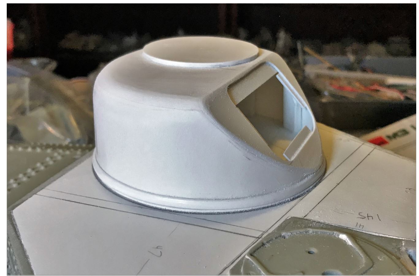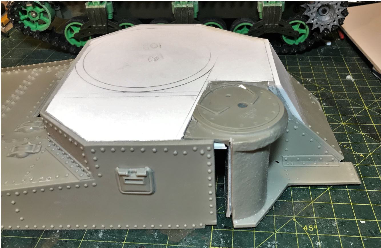 Measurements for the gun mount are extrapolated from the Miniart 1/35 kit and the frontal plate is made. I also added the ring at the bottom of the turret. A flat surface of the right dimension is made for the cupola and positioned on the turret.