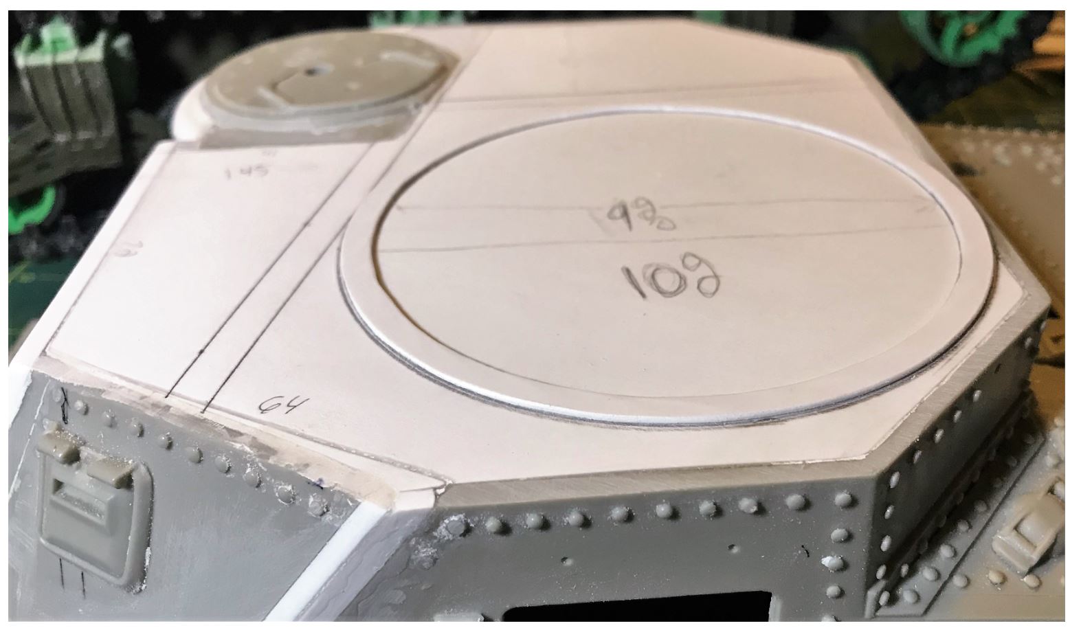 The hull turret ring of 102mm in diameter is made in 1mm plasticard using a simple geometry kit. The plasticard is lightly engraved with the point of the tool in a circular movement, then the plasticard is snapped off the part and sanded smooth. With the number of rings and roundels needed on my builds, i am getting a compass cutter, more efficient.
