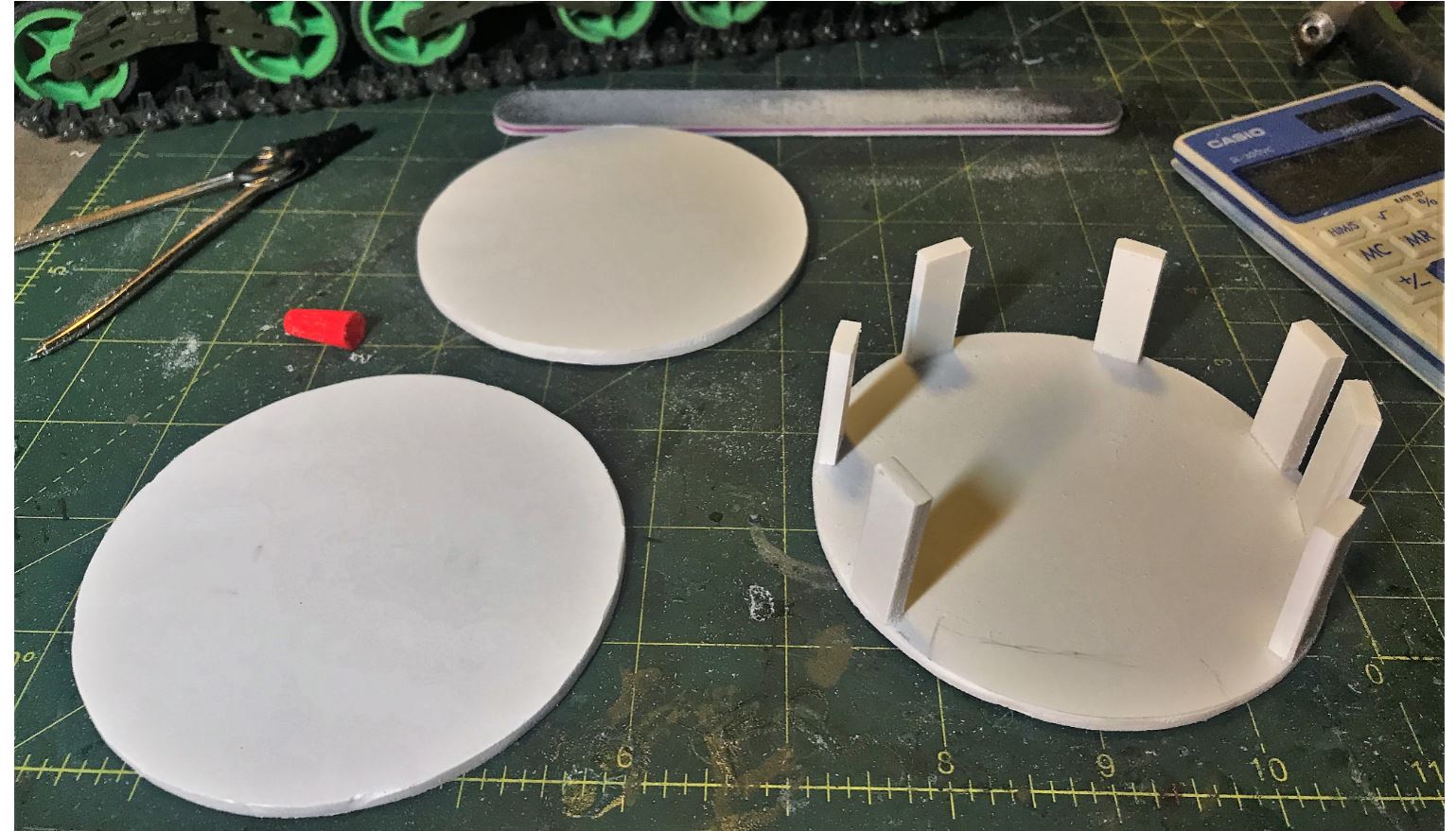 The turret body is made to be 102mm in diameter at the bottom and 40mm high. The turret roundels are made to be 98mm wide knowing that the 1mm side armor plate around will add 2mm and the ring at the base is adding another 2mm in diameter, giving a planned total of 102mm. The mounts are given a small slope towards the inside top, except under the cupula.