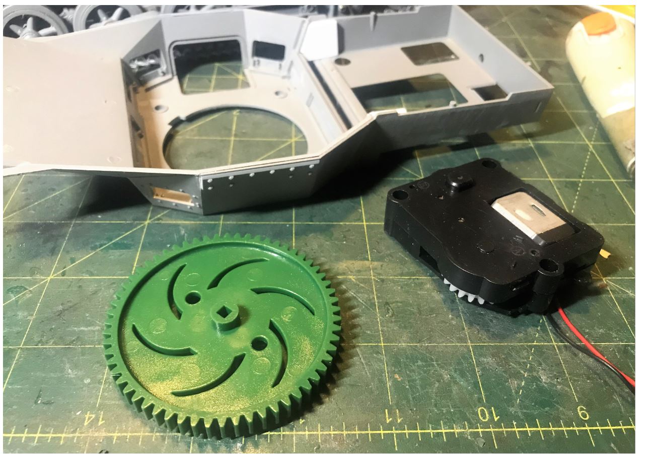Rotation can be done with a VEX robotics mid size gear and a standard Heng Long unit. Because of the configuration of the upper hull, the location of the rotation unit at the back is lower than the turret ring. It will require some spacers for the gap.