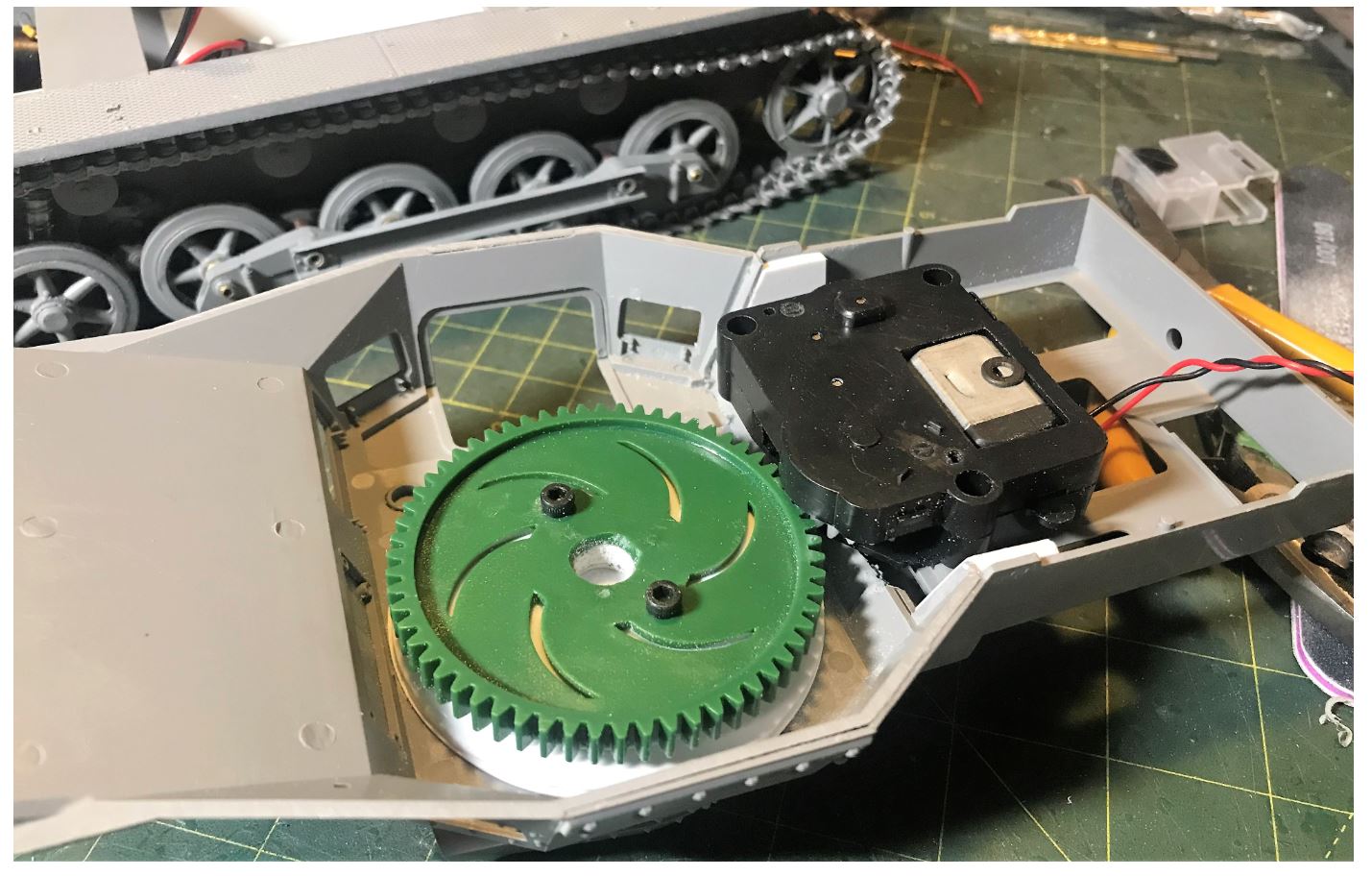 The rotation wheel is put in place after carefully calculating the center. It is essential to avoid any wobble. The location is tested first with a couple of superglue droplets, finetuned as required, and then fixed in place with hex bolts when the perfect location is determined. After some grinding of the plastic bar between the middle and rear section of the upper hull, the Heng Long rotation unit is put in place. Some grease is applied to the rotation wheel joints.