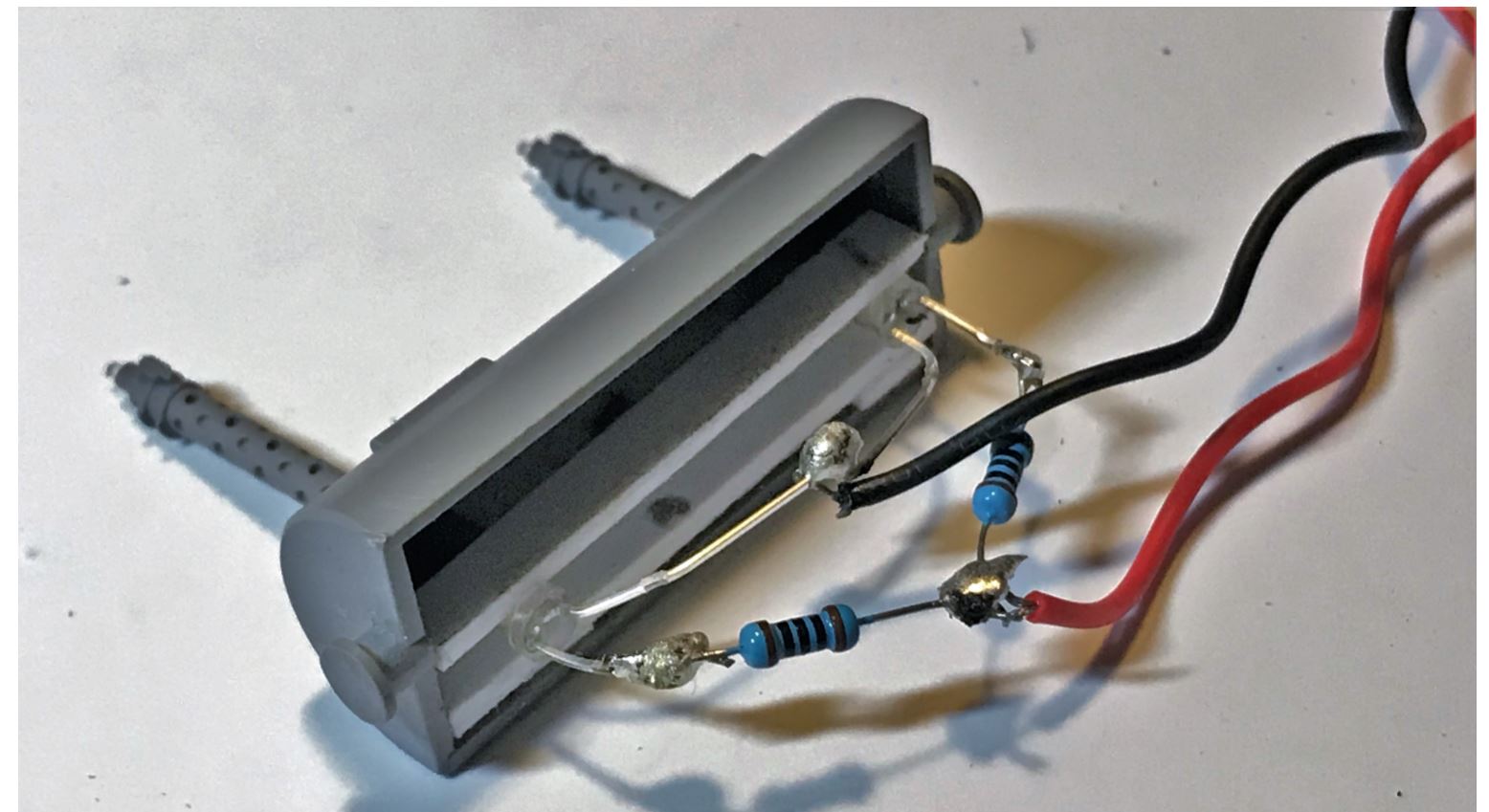 They are installed on the mount and the LEDs are connected on the back using the wire and resistor provided in the 35RCTANK board kit, glued and reinforced in place. Resistor always going to the Positive longer leg of the LED, and absolutely required to avoid frying it.