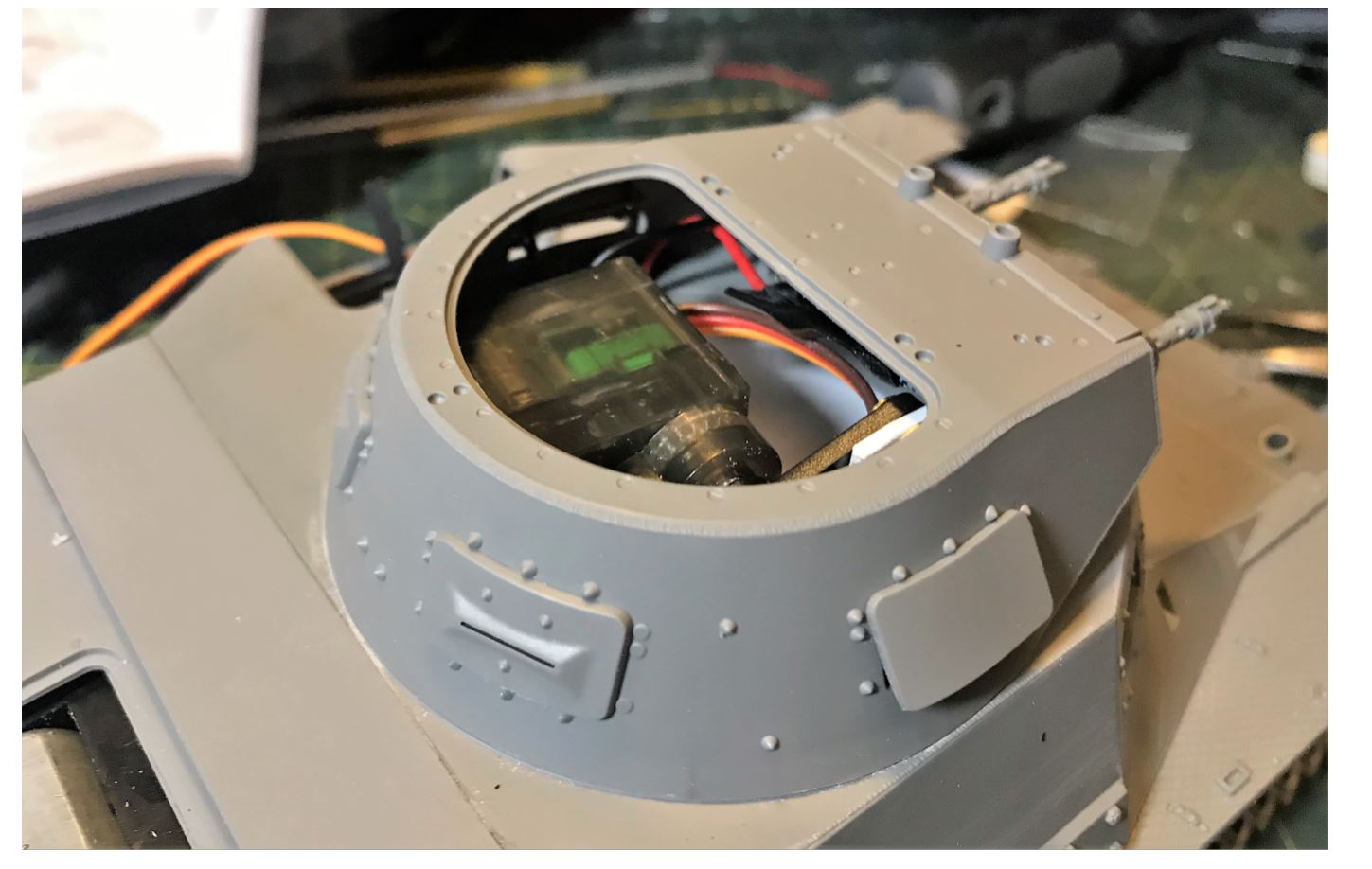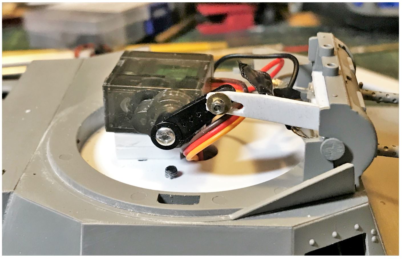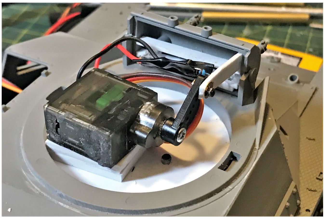 Elevation is provided by a simple arrangement of a micro servo with an arm connecting to the twin machine gun mount. Unceremoniously glued in place with a couple of superglue drops after the optimal position has been found. No need for over engineering, this is not a King Tiger 88mm with recoil...