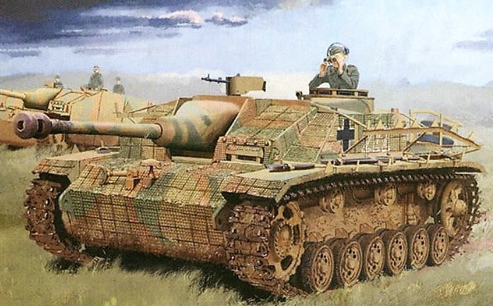 Dragon kit box art showing a Late model Stug III with the remote control machine gun which replaced the shield and manually handled MG34.