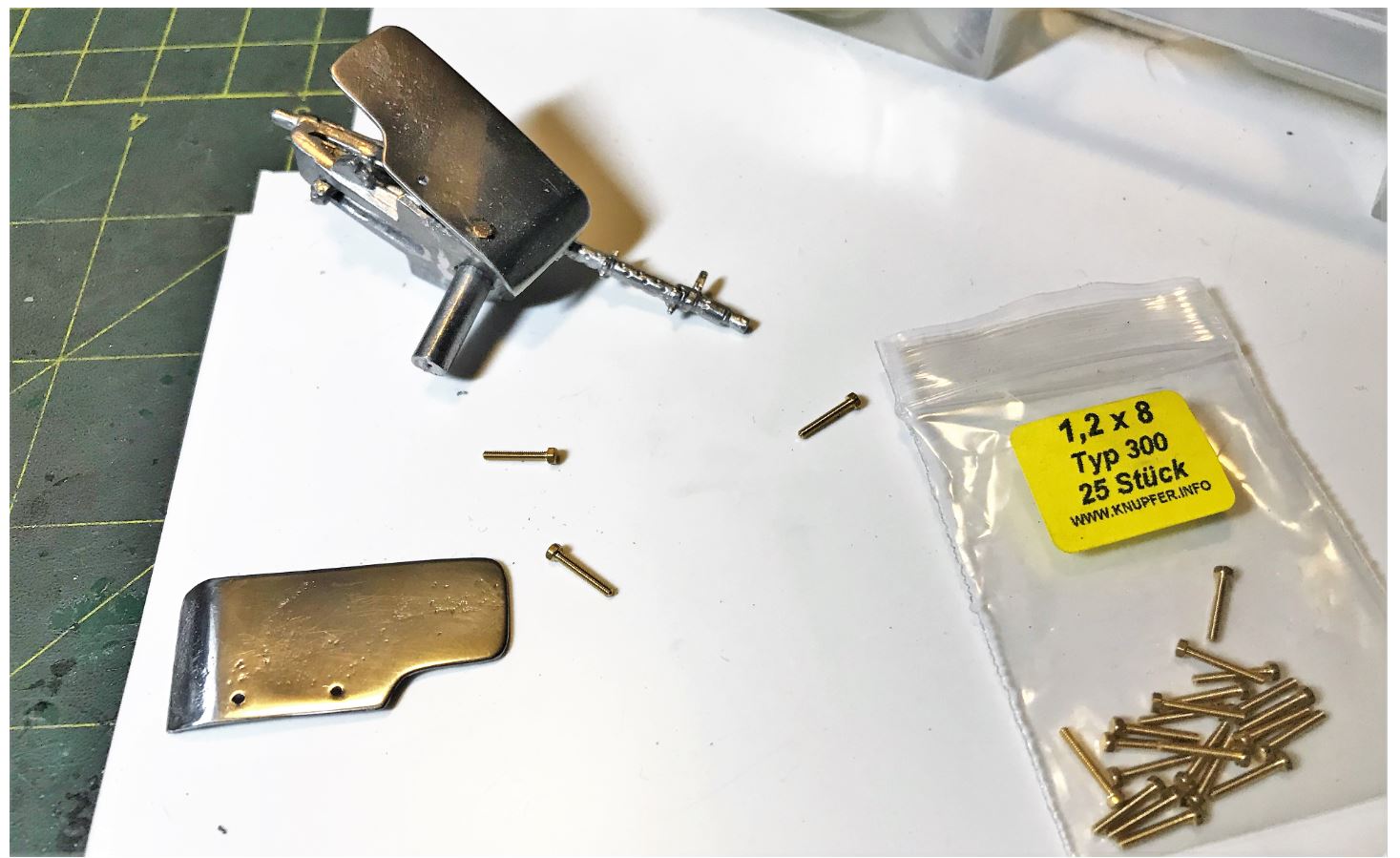 View of the PanzerParts.com Modellino Late Stug machine gun kit. The parts have been prepared, cleaned, polished and ready for assembly. It is reasonably complete, i would not be able to do better. The whole Modellino kit is a good deal for the price, avoiding a lot of scratch building. The stock for the MG34 is optional and did not install it. This kit is like a small silver jewel.
