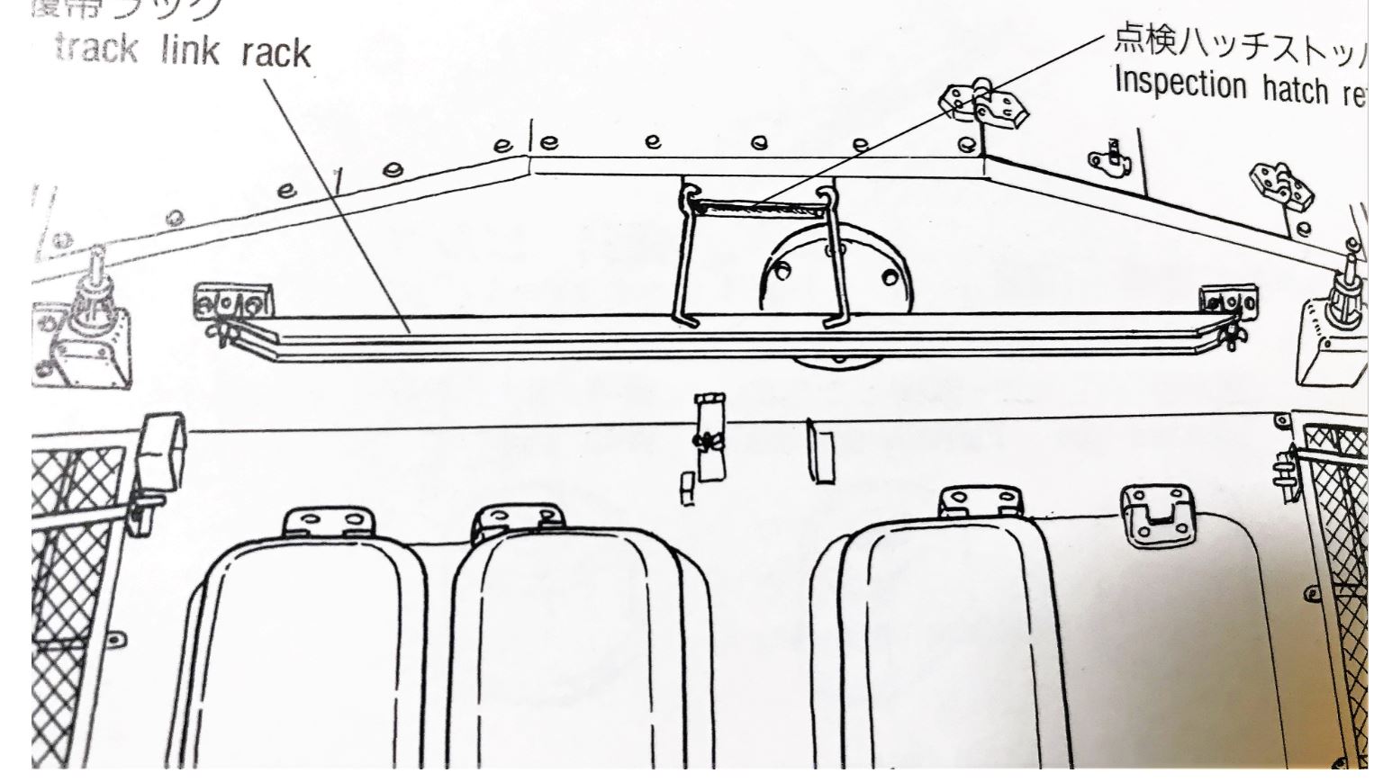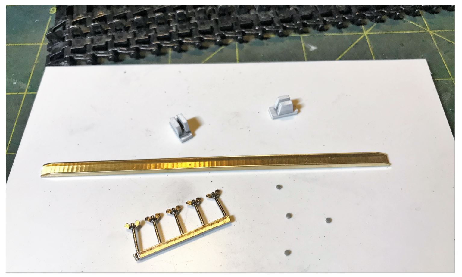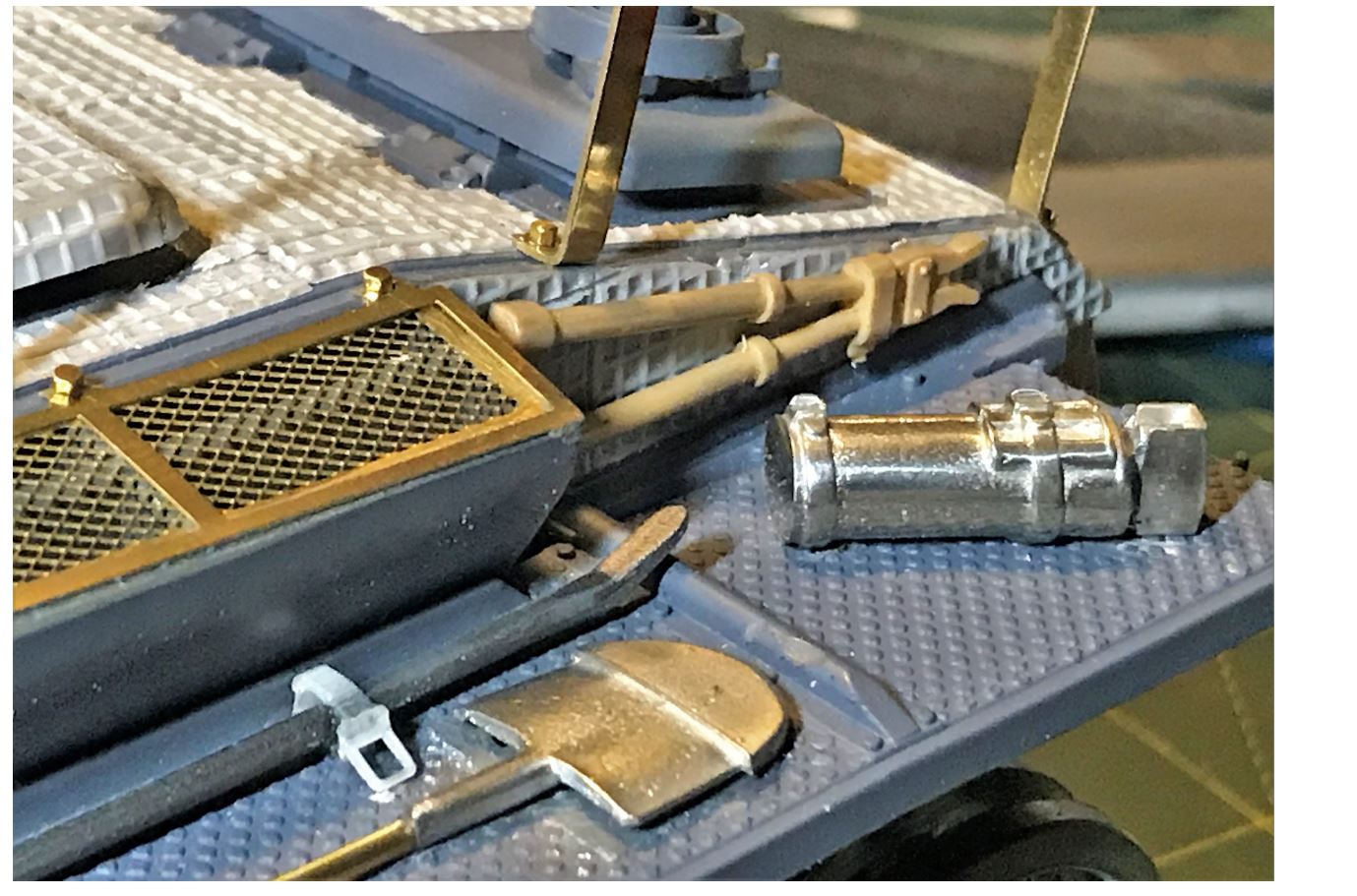 The gun cleaning poles and fasteners needed to be installed a bit more towards the rear to allow the spare tracks to be put on the rack, testing is required before the glue sets. Otherwise, the spare tracks won't be able to fit on the rack above the rods. The rods were shortened a bit and the bracket was given a metal butterfly nut for better detail.
