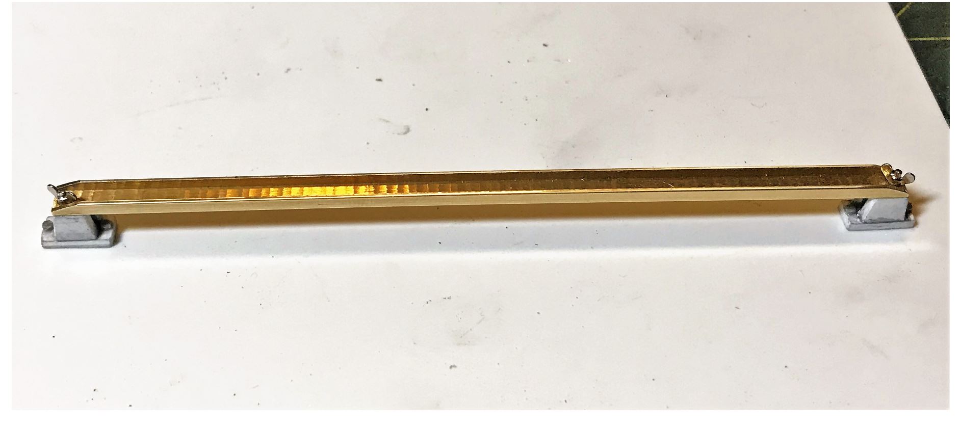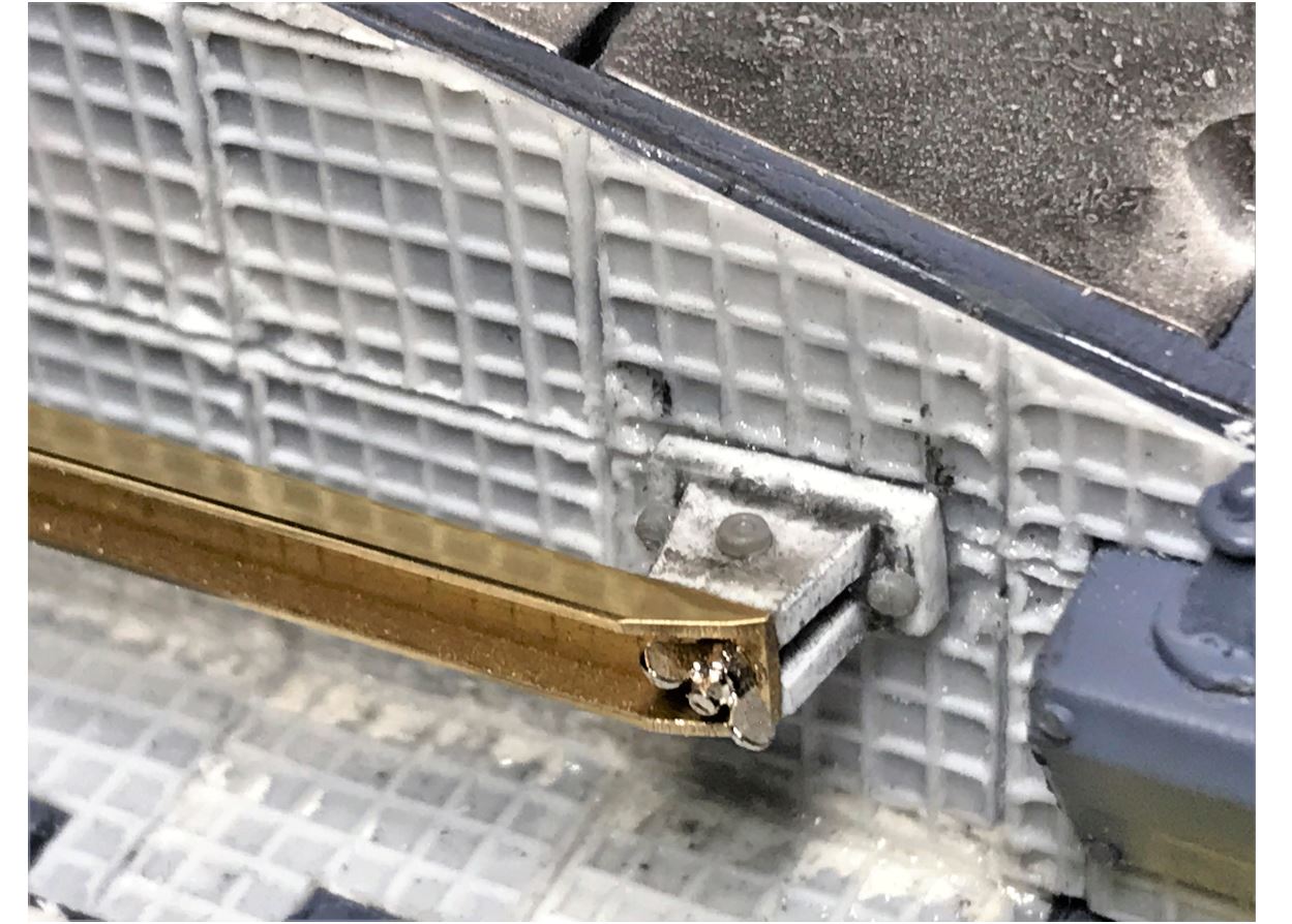The side attachment points were made in plasticard strips and the metal parts are assembled for the final contruction. A 4*2mm brass channel beam is used for the rack itself.