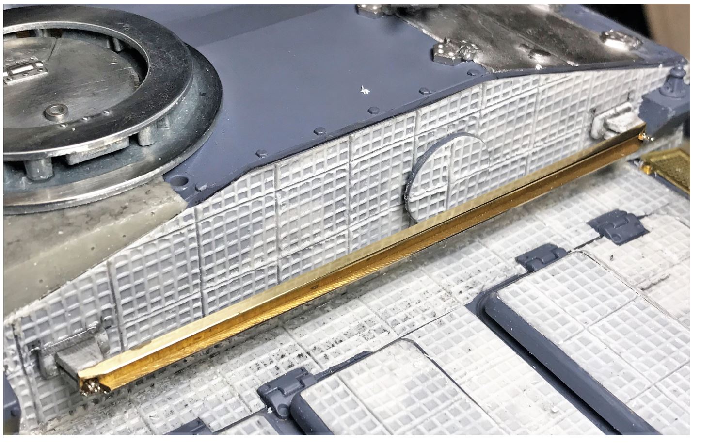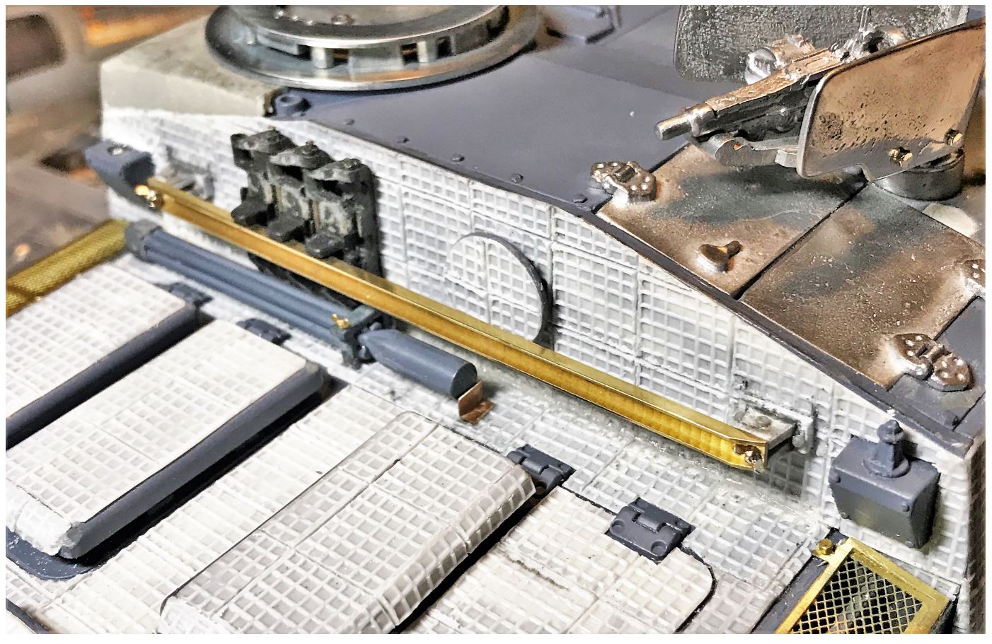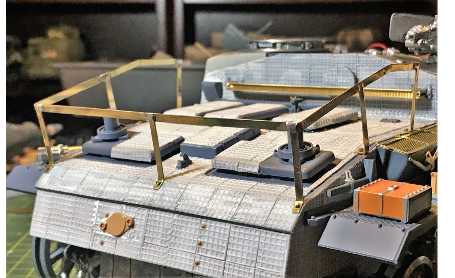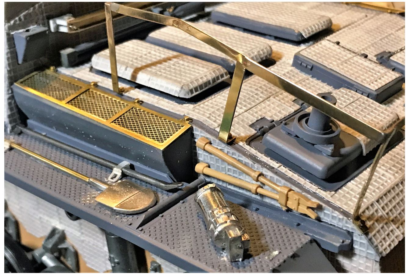 On the Late Stug models, the spare track rack was moved from the front plate to the back of the fighting compartment. The rack and attachment points are of a more elaborate style and need to be scratch built.