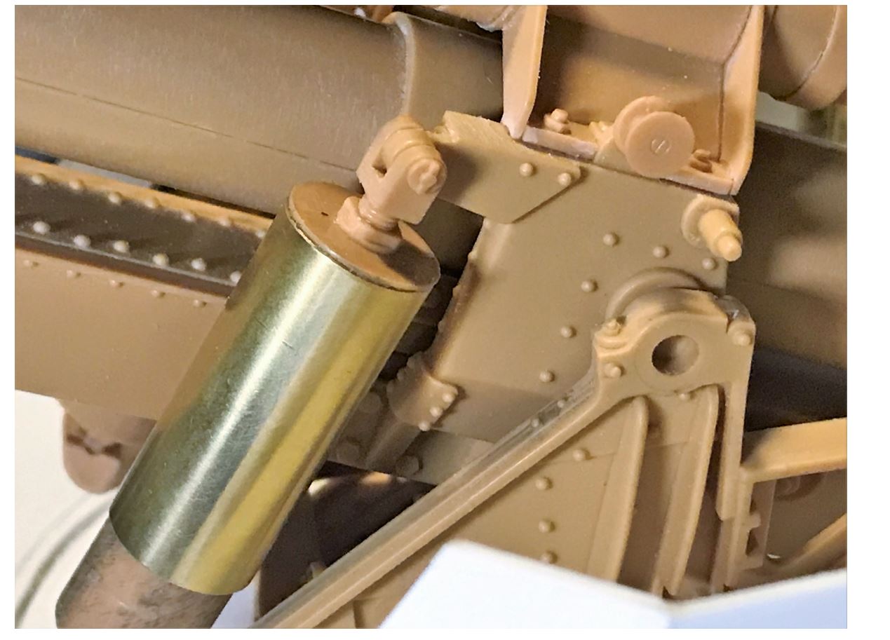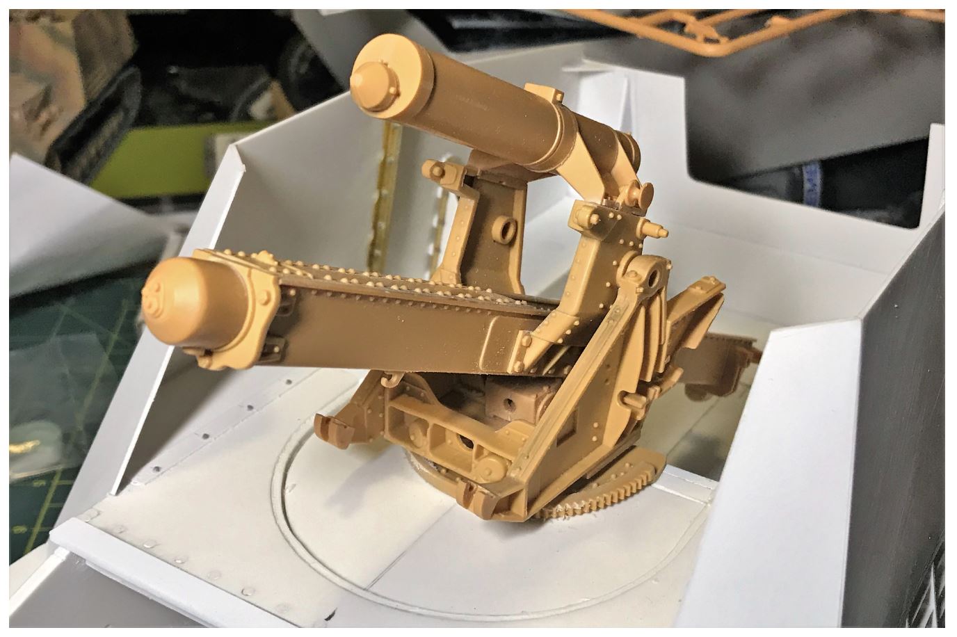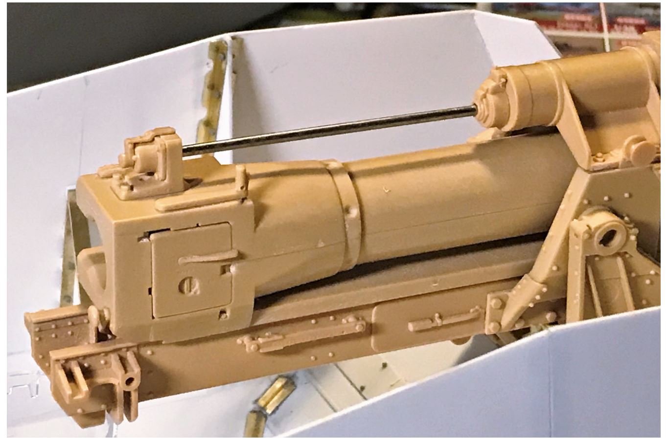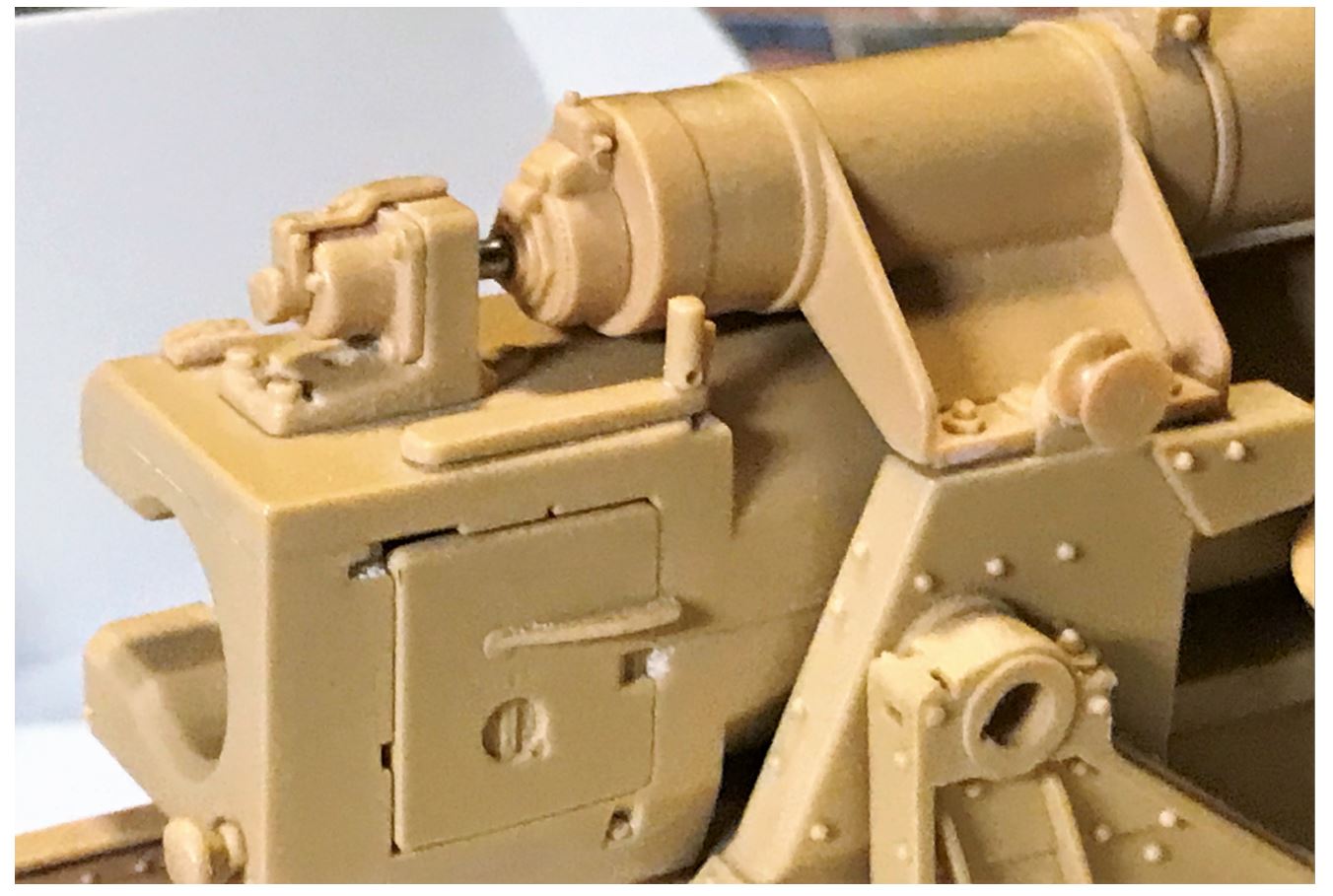 A hole was made at the front of the gun mount, providing enough room for the push rod to operate freely. All this area will be hidden behind the gun shield.