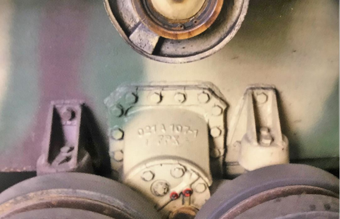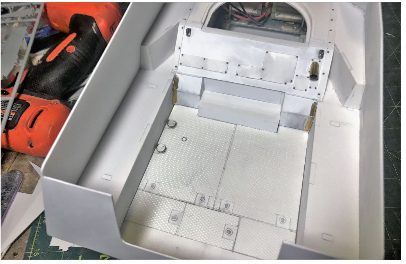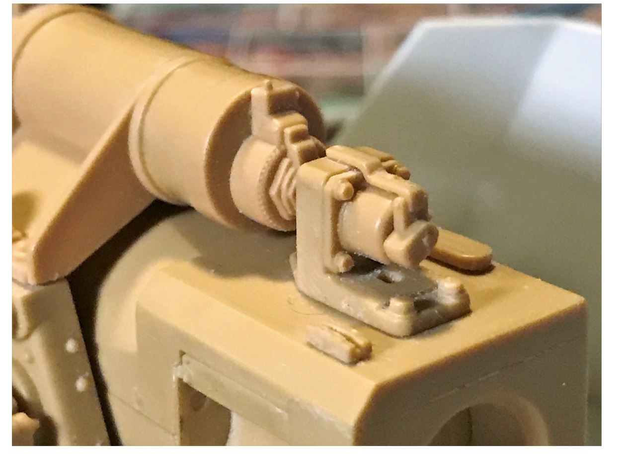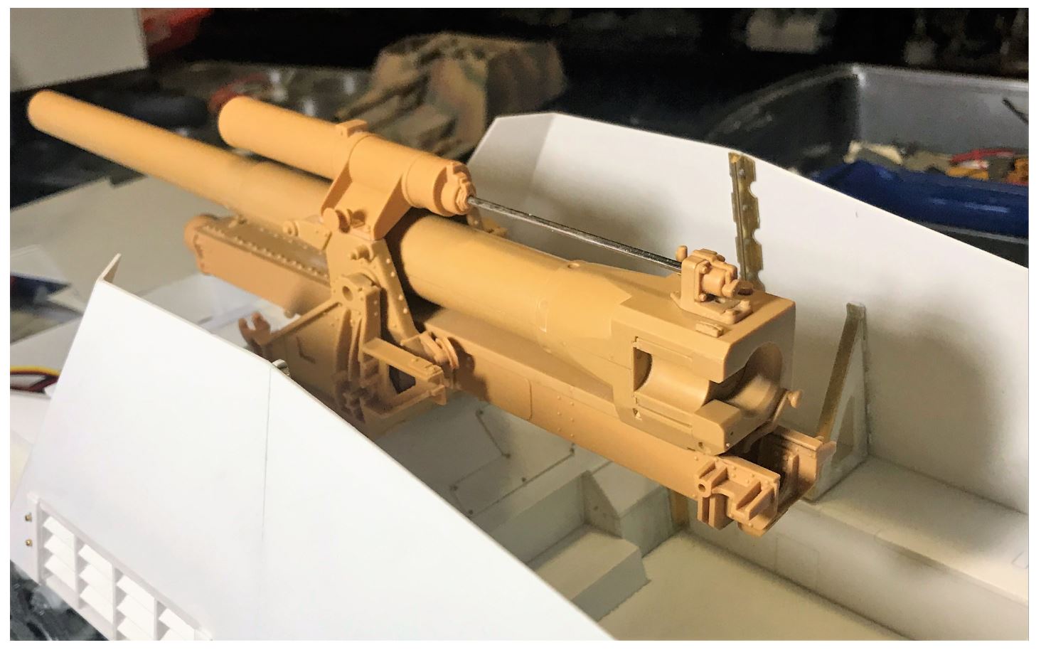 A hole was made at the front of the gun mount, providing enough room for the push rod to operate freely. All this area will be hidden behind the gun shield.