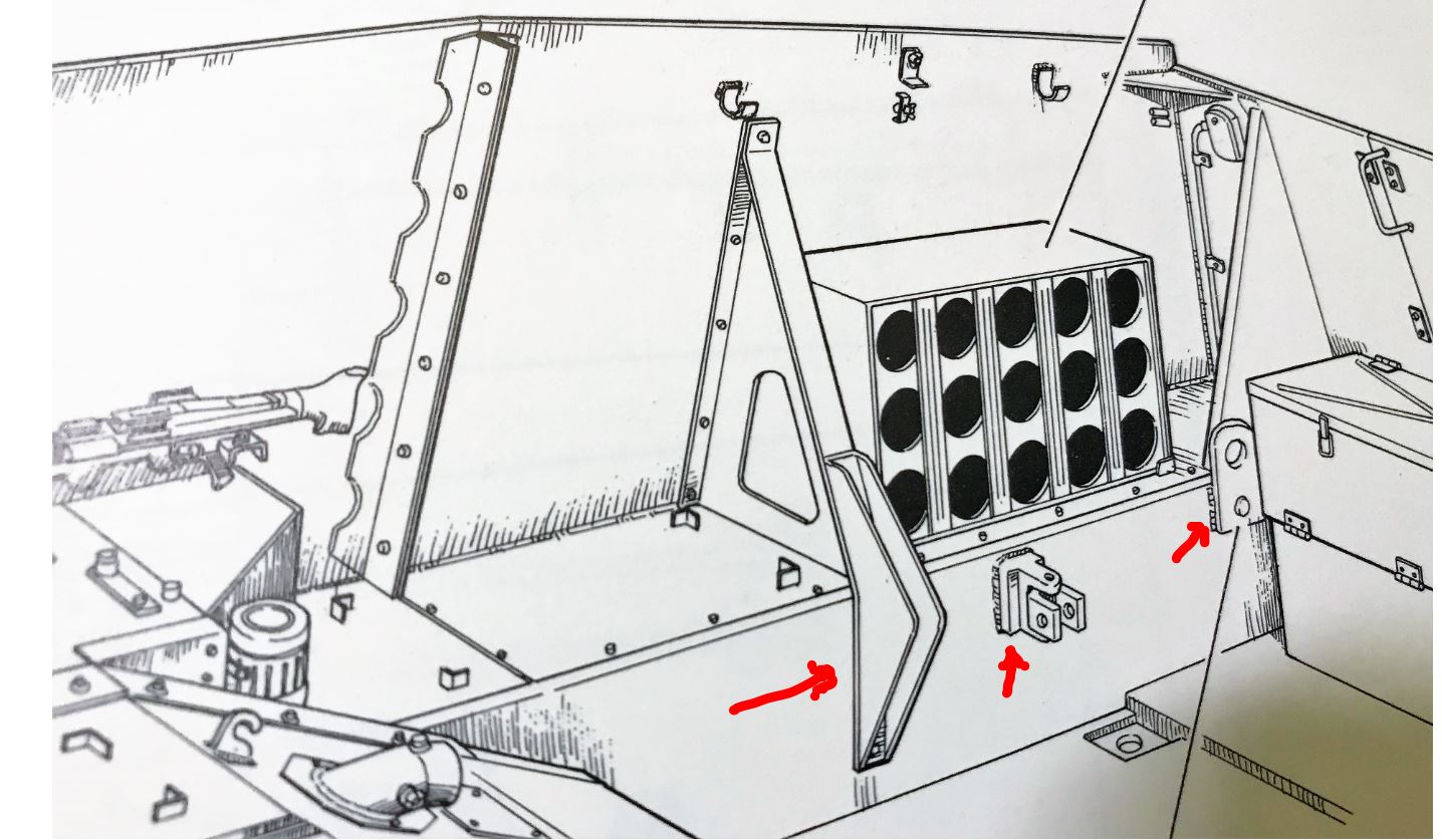 View of the left side. It is difficult to find good pictures of the interior of the Hummel. The interior is different than the Nashorn, and remaining vehicles are sometimes incomplete, or were restored with non original material. Those 2 braces are not simple plate that can be reproduced by a single plasticard part, they have a lot of features and it requires study from a few angles to determine how they are made. There is also a section going down into the tub that cannot be reproduced at this time as it would prevent the floor from being removable to access the track adjusters. The 1/35 kits were also very helpful.