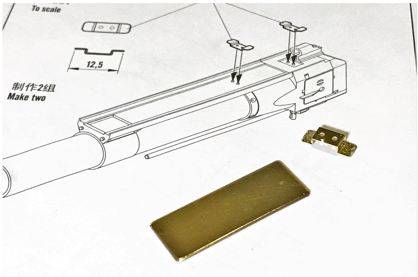 One change i did is replace the two small photo-etched sliding breech recoil attachments by a single equivalent 12mm wide brass strip, polished on the edge.