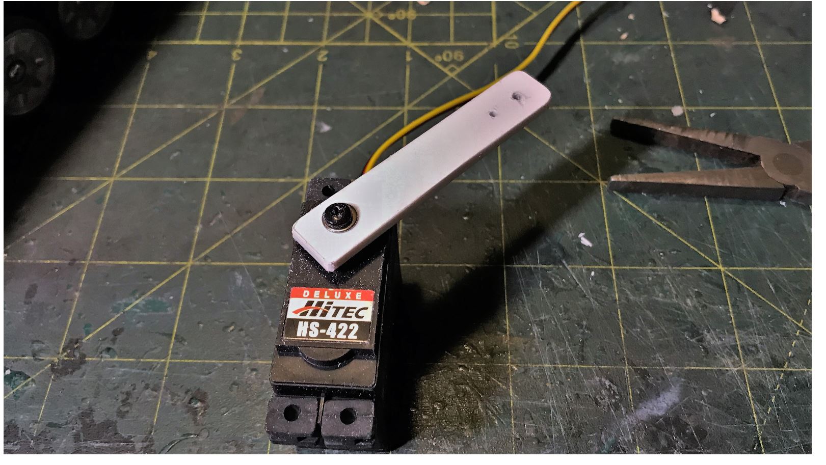 Installation of the recoil servo and push rod. Although the wire has some flexibility, it is better to align everything as much as it is technically possible at an angle and orientation that minimize friction along the way. It took a couple of attempt finding the perfect position.