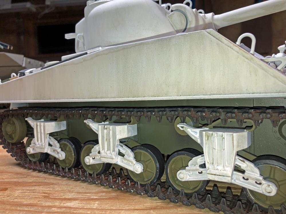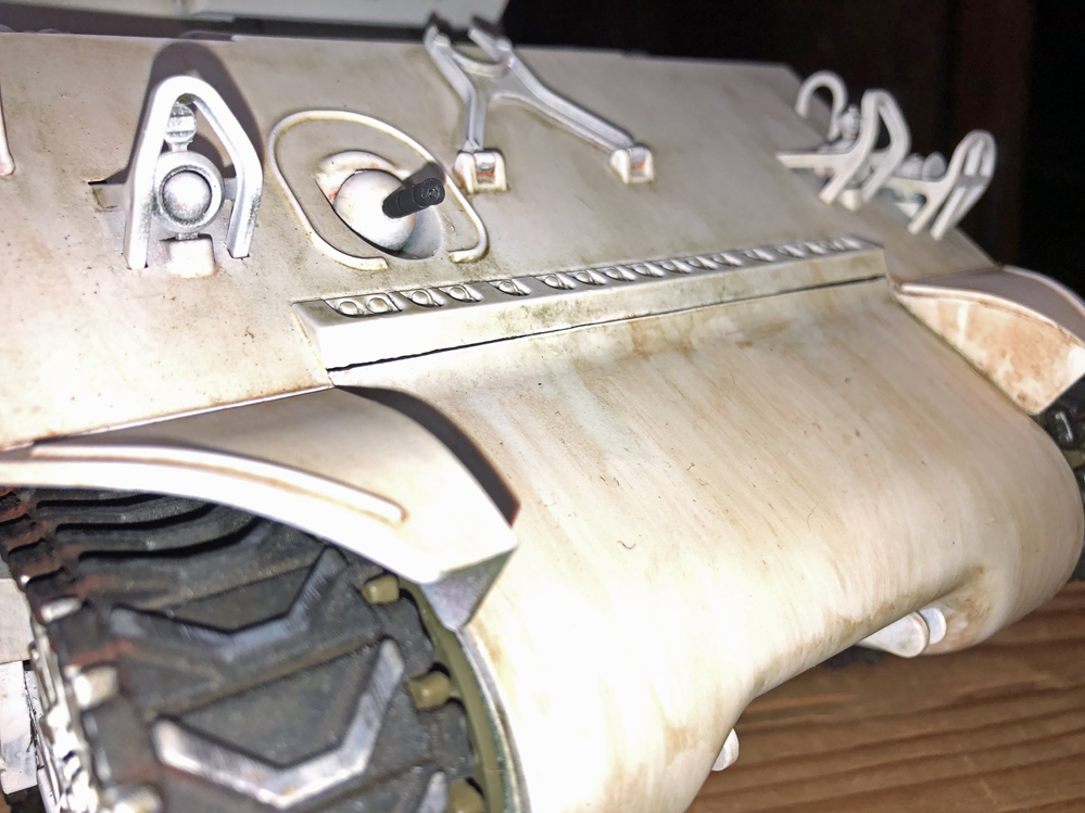 I got some time to start weathering the wedding-dress winter-white Sherman. Cringing all the way, I streaked with oils until I got something of the look of the two M4A3 105s in the photo of Jan. 1945 in Hochdelden, France (photo above). If you click on the photos to expand them, the weathering becomes more pronounced.