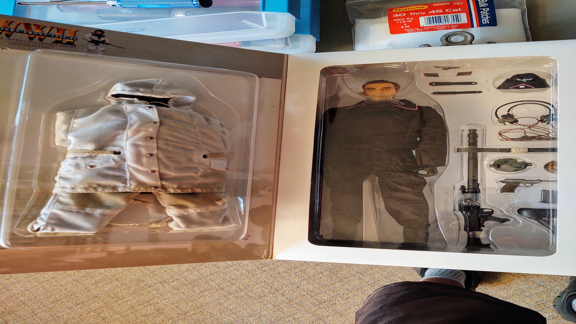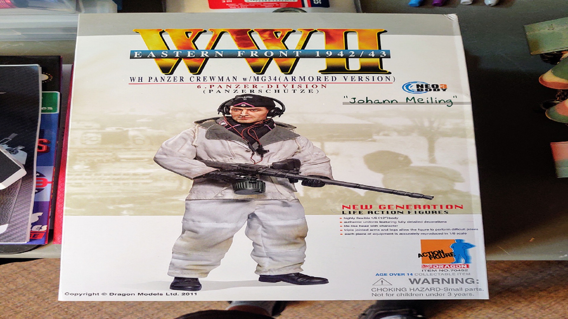 A good find, though not quite the right time frame, nor division. It is pretty cool that Johann has the armored version of the MG 34 too. As I've said before, I'm not a real big fan of 1/6 scale figures, but for this price it will be fine to display him next to "Geli' as I have christened this as yet built Panther. As soon as we got home and dispatched the pizza I took Johann out of his box and started putting his accessories on. Jess who has been bombarded with all sorts of historical details over the last 32 years on all manner of topics, knows that most WW2 tanks were crewed by 5 men. So then I received the question: "so just how big is this tank of your's going to be exactly?". Seems she's having a problem imagining just how large a 1/6 scale tank will actually be. I guess in all truthfulness, so am I!