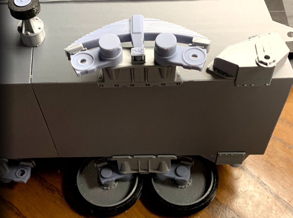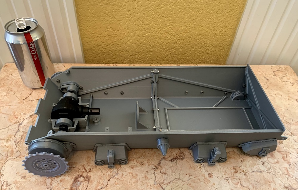 Got the suspension all done. Works amazingly well and fully scale operation. Each spring leaf is modeled to scale dimensions and camber and individually printed (all 64 of them). Spring packs pivot as scale too. Lucked out that it all worked on first try! Next up is getting some wire to start assembling the tracks and still some more experimentation on the final drive. I've got it geared a bit low, so need to modify. I got the steering brakes put together, but that needs some tuning - all the fits are a bit tight. I probably need to change the brake drums to something more frictive too but the basic concept is sound.