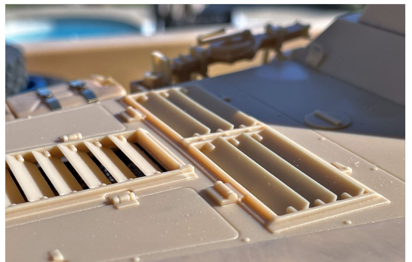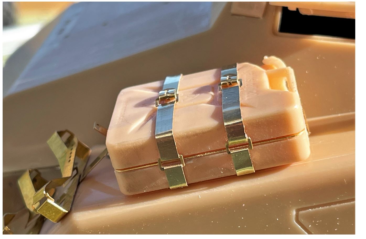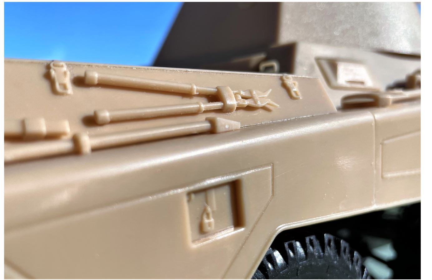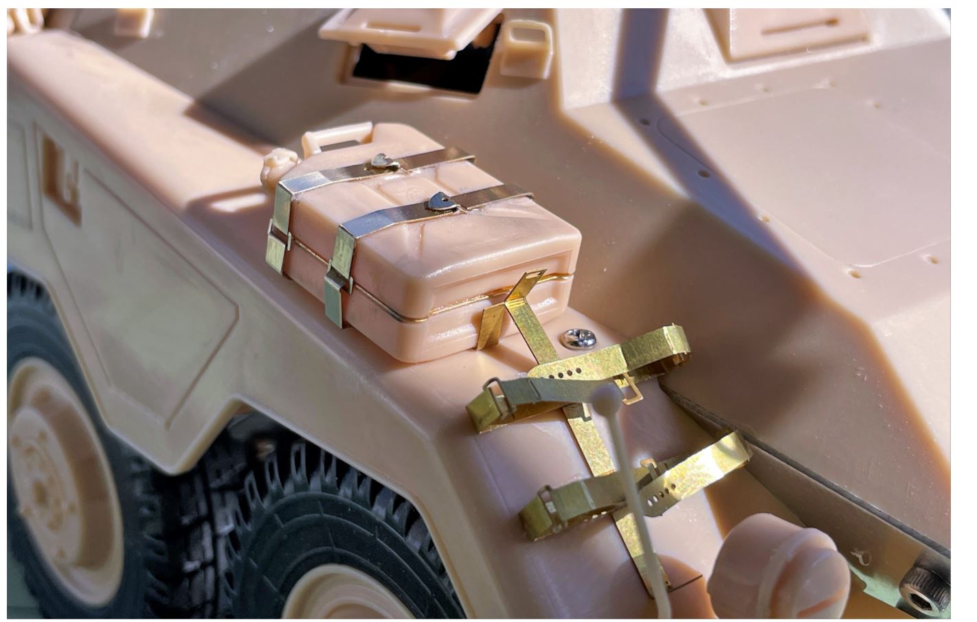 Notice the small screw to remove the fenders that would otherwise be under the front Jerrycan. If you hide that screw or glue the fenders in place, you will no longer be able to open the vehicle.