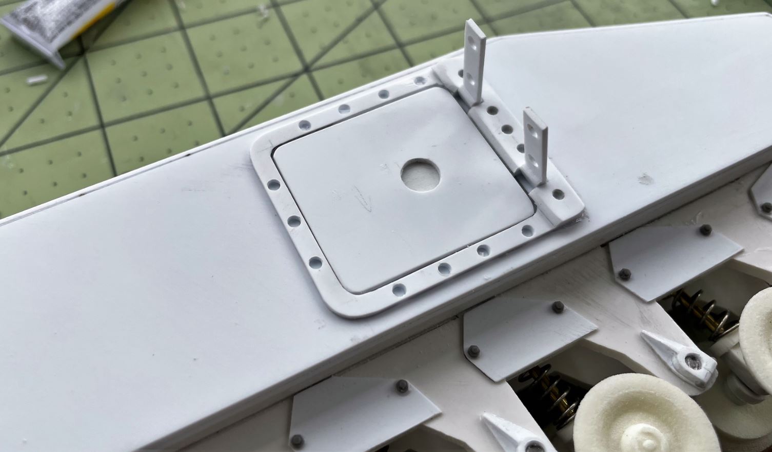 The side doors are complex to reproduce and quite rich in features, including holes for 20 bolt heads of two variations that need to be done with the basic tools that i have. The door is positioned prior to gluing the operable hinges on its flat surface.
