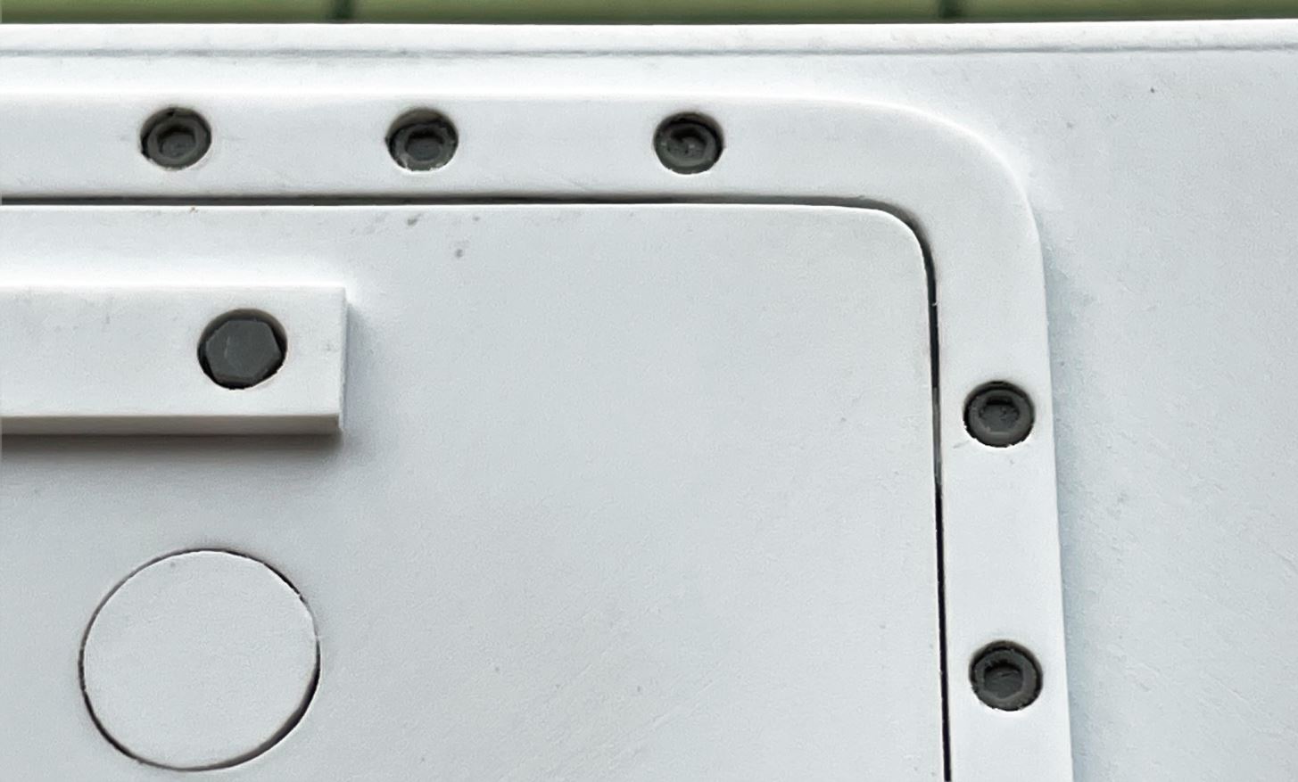 The bolt heads on the door frame are 1.7mm Meng SPS-008 while the 4 large ones on the door hinge are 2.2mm Meng SPS-004.