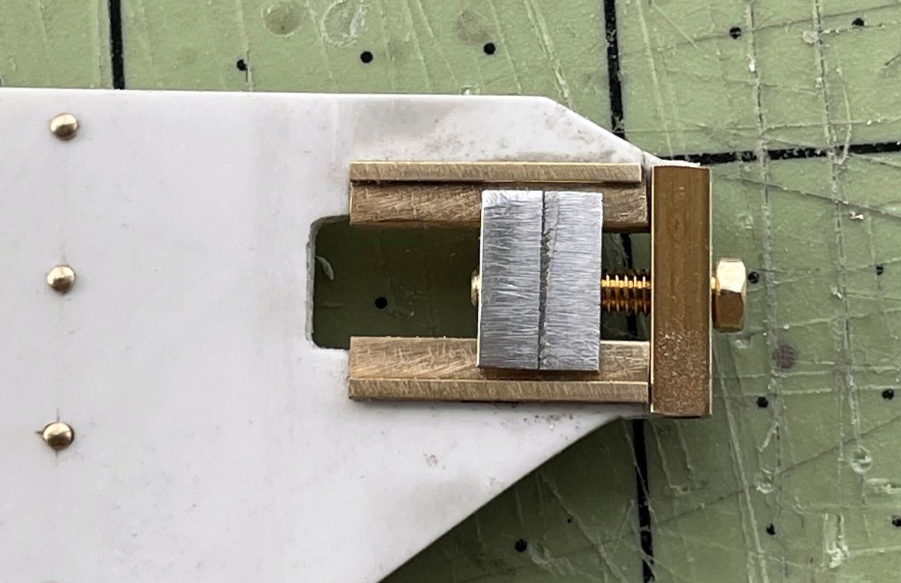 I could see in reference pictures that the adjuster runs on rails. These can be reproduced using brass channel strips. Its better than being strait on the plastic, more solid too. I sanded the exterior side of the strips a bit to make them less thick. The plastic part also needed preparation as they no longer use the Ludwig base pattern and dimensions.