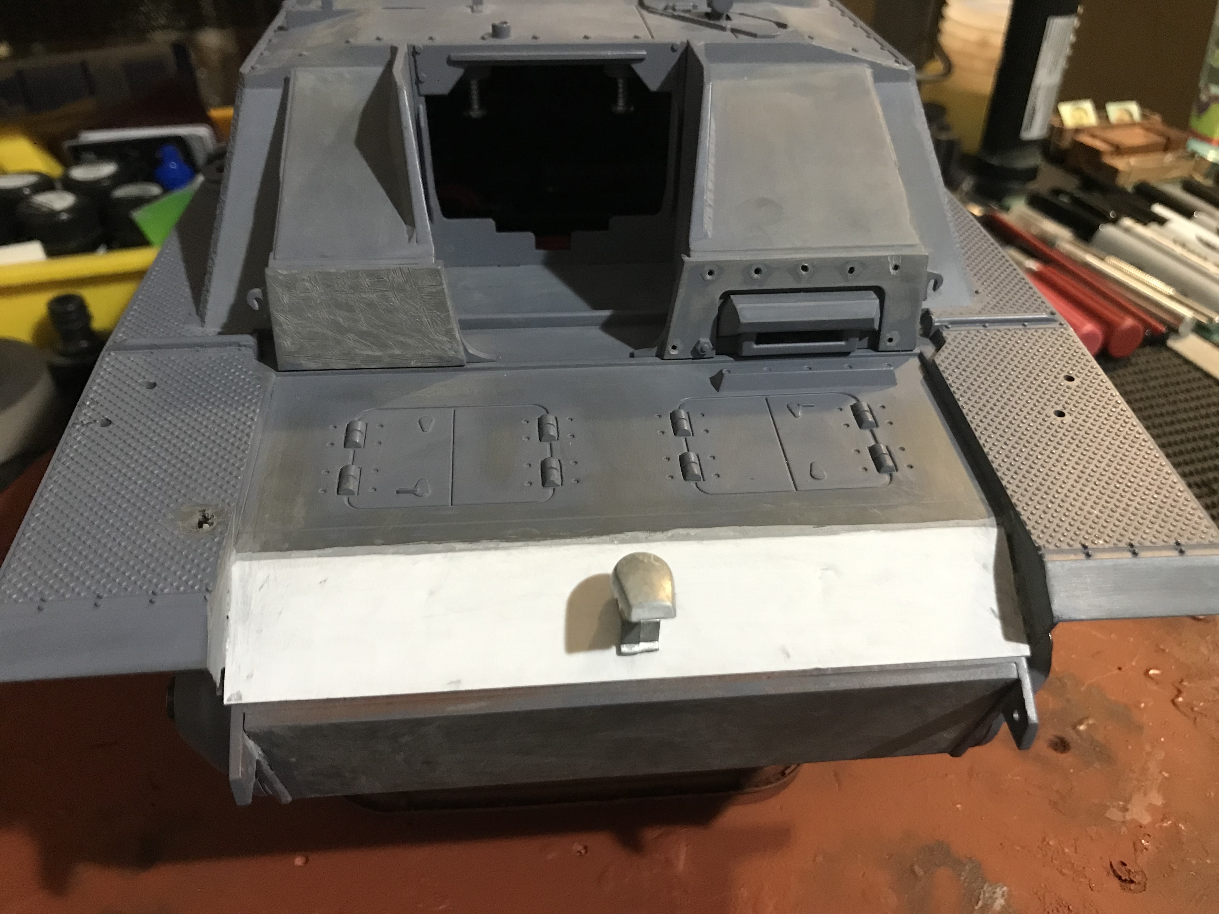 Something tells me that with the key parts coming from Germany, and the expected delay on those, plus the Zimmerit needing to be done the old fashioned way that this will fall into a lull for a bit then pick up again.