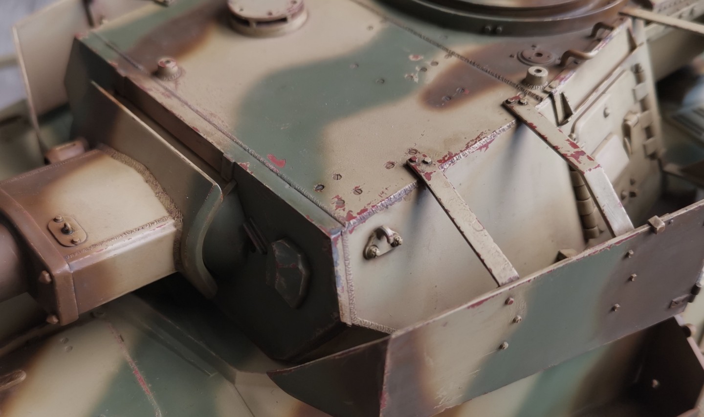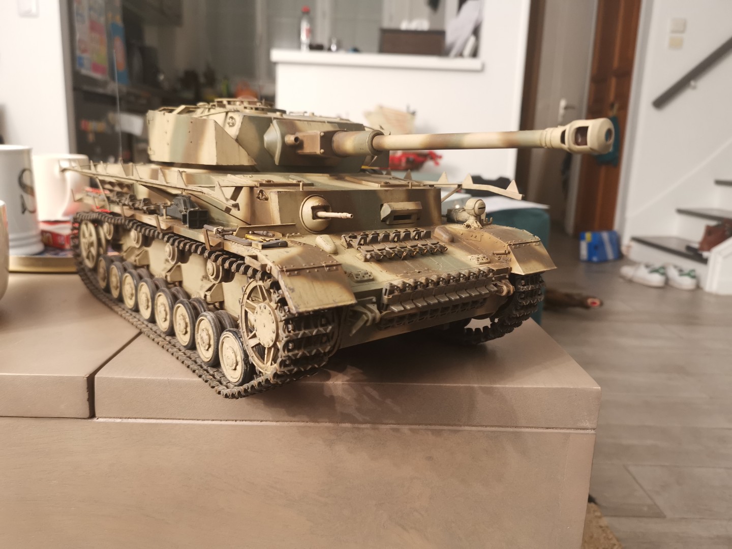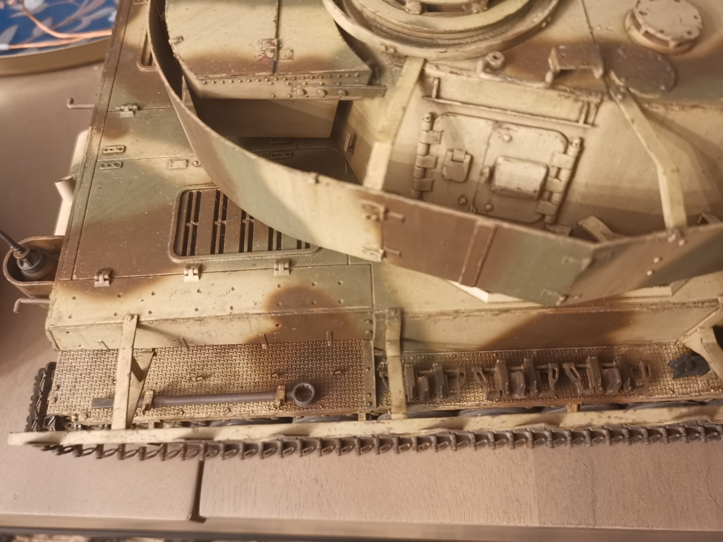 I've started the camo of the PAnzer IV, going for the 3 tones camo. Here is a preview Pic, this is the early stage, I still have a lot to do. That's my first 3 tones camouflage and the first time I was using the LP Tamiya paints. Hairspray doesn't work with those paints for the chips so they have to be do one at a time by hand but I got real chipping paints which looks as good, even maybe better than with the hairspray technique.