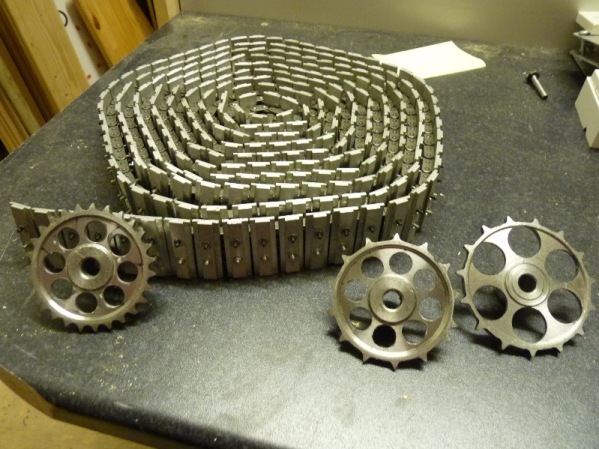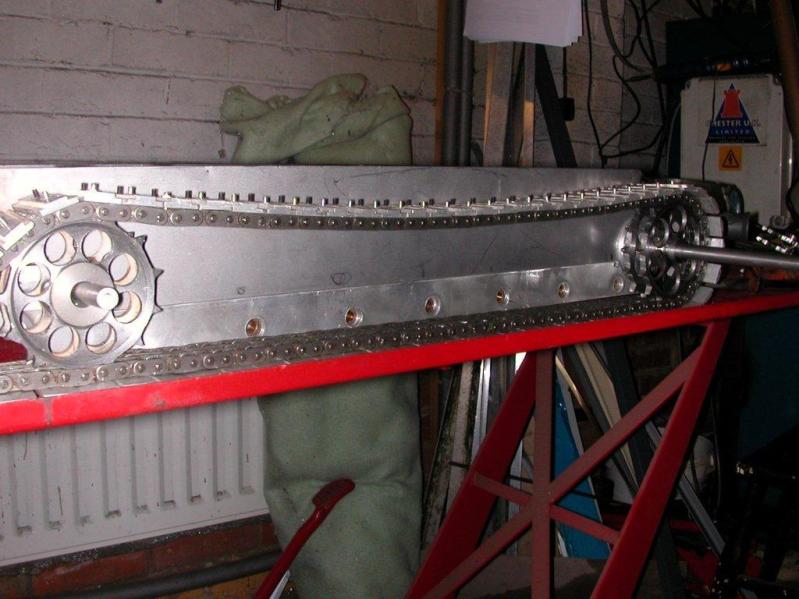 After our twin disasters with the 8 bogey wheels that had to be redone and the entire 320 tank track picees having to be drilled twice each to remove, countersunk deeper in each drill hole and then hand redone fitting M3 nuts and bolts we have finally passed that point and manage to advance our builds. The tracks are now finished as seen in the photos. The method that we have now used using nuts and bolts has given a far better and more consistant spacing of the track pieces and maintained the correct distance between the 2 chains underneath. Whilst doing all this Frank has been busy designing and making the main drive and rear drive bearing holders and has had to design a method of altering the rear drive wheel to take up slack in the tracks. He has also tacked the main body together and we have quickly assembled some of the pieces together to give an idea how it has progressed so far. Remember there will be double cogs at both the front and rear once we have cut down the shafts and welded the cogs together at the right distance apart. Hopefully in the next few days we will have the full running gear assembled along with the tracks and then we can start to assemble the upper body and design our power source system.....Any comments welcome....