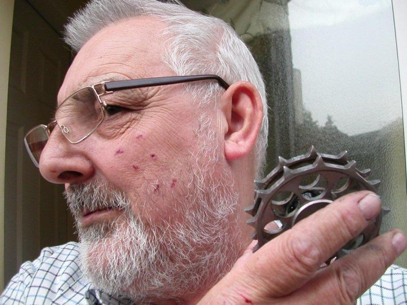 My warning to anyone using these types of tools it to avoid complacency whilst using them. Yesterday Frank was reducing the size of the bosses on the drive cogs in the lathes when the double cog flew out and hit him in the face. Look at the photo and see the twin cuts when the teeth have penetrated. Although the photo is horrible to look at please note Frank has always been this ugly and the majority of what you see is awful to look at but is how he has always been