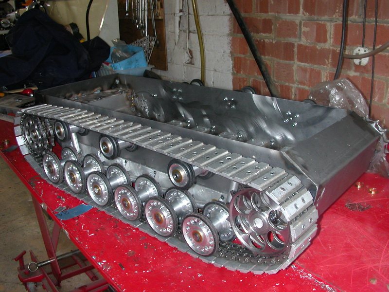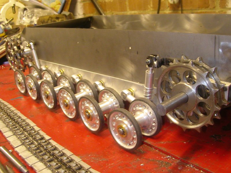 Finally it is coming together to start looking like a tank.. We have finished the suspension stops and fitted them. We have added internal suspension to the 4 middle wheels on each side and we have fixed all the wheels and cogs permanantly onto the tank. Saying that, we are now wondering whether to modify the rear cogs so that they go either side of the chain so you cannot see the chain.We think it will look more realistic.I know it is still a long time until completion but we are already wondering what is our next project and what size to build. We have to rule out tanks that have a lot of curves as we do not have the equipment to easily bend metal to the right shapes.I really fancy the M3 Half track in 1/6th scale. Any of you have any good ideas taking into account our limited metal shaping ability....Any ideas most appreciated and any comments on this project also appreciated.