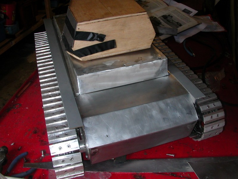 The pictures show the first tank with a basic top joined on and a turret template made out of plywood. If you look closely you can see the first pieces made out of metal taped onto the template turret and eventually all the turret will be metal joined together and the wood turret will be discarded.