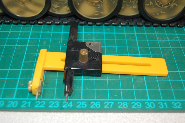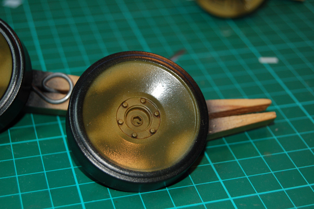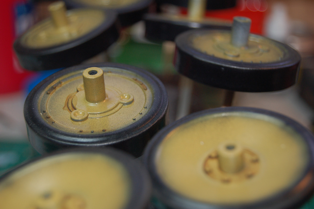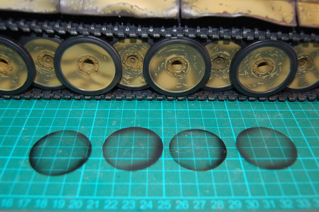 Now for the wheels and hull. I primed all the wheels and hull with grey primer, then sprayed them with the base coat and lastly the camouflage coat. Everything was straight forward and then came the black rims. On the inner wheels the black rims were sprayed freehand as I didn't think that over spray matter would too much. The outer wheels I did a bit differently. As these had camouflage on them I didn't want any over spray so I decided to make a mask out the clear plastic you get off toy boxes, etc. I measured the diameter of the Tiger's road wheels and used a compass cutter to cut them out. I cut out 16 masks which took about 10 minutes give or take, then I struck them on the road wheels with Blu-Tack. All I did then was spray with the black paint. Once dry I removed the masks and sprayed the wheels with two coats of Pledge Klear floor polish and two coats of flat varnish.