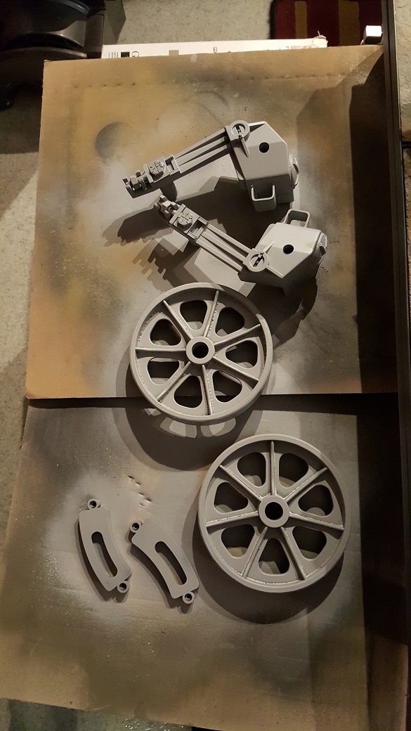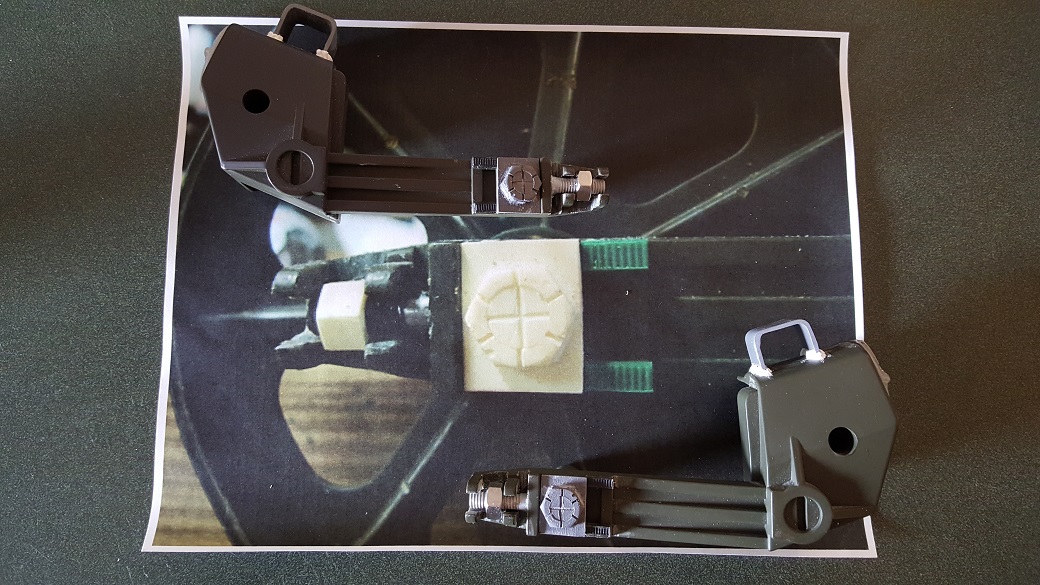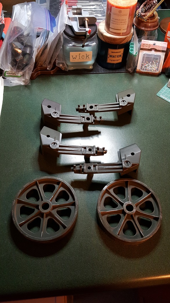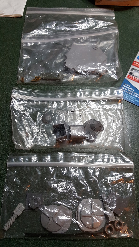 I carried on with the Idlers and their mounts tonight and tried out my idea for a tin base for the existing hollow piece. I cut out one and bent it to fit and looked at it one way and then another. To be honest, the effect I wanted from it ( a moving idler mount ) can be achieved with a couple of pieces of brass tubing and a some washers. ( all of which I have ) So I gave up on this tin horn idea and gathered up the excellent resin and plastic detail bits that John from East Coast Armory had sent my way. Some clean up will be needed but it would not be a model if 'flash' was not an issue at times. Pics: ( Click to enlarge )