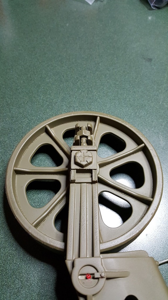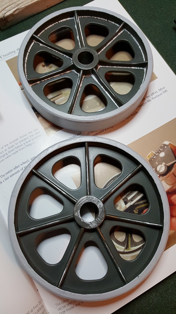 After the day was done, I sat down with the idler wheels and mounts and gave them a once over. The differences between static and rc versions were negligable and mainly had to do with the size of screw which mounted them. I went with the static set that Mike sent over since there was no channel in the middle of the idler itself to guide the rc version tracks. An hour of filing followed to clean up the surface of the idlers and add a bevel so as to simulate the tire. I used the Mr. Surfacer 500 to give some texture to the plastic 'tire' and am pretty satisfied with them. I do not think that I will be adding letters to these since they will see a lot more use outdoors. I'll pick some of the rest of the detailing to do to bring them a little more realism. Pics: ( Click to enlarge )