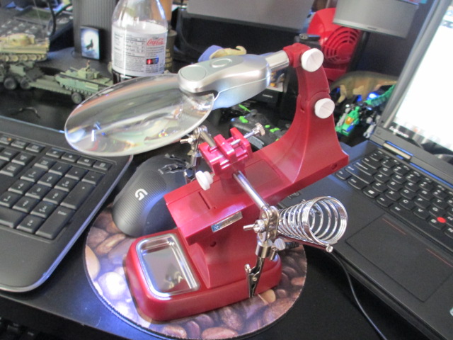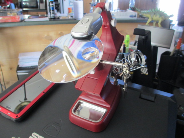 Waylon and Jack really love it here. Plenty of run-run room. ;o) I bought another lit and magnifying tool to help out. A 3rd hand. Here is a pic of it and the latest work I am dealing with in the evening. Pics: