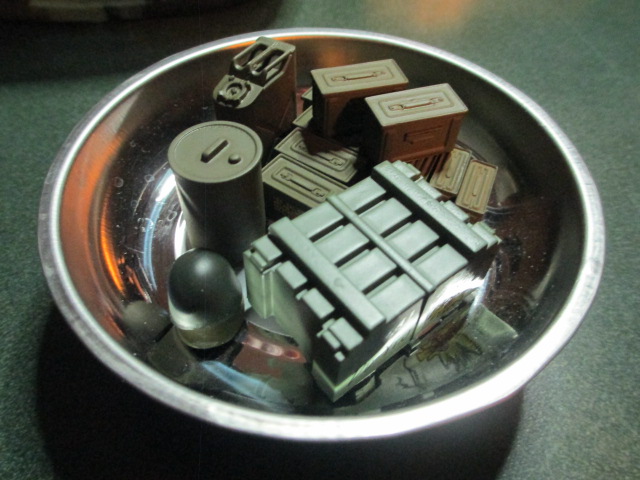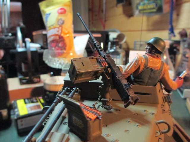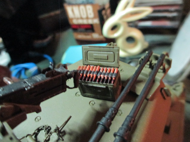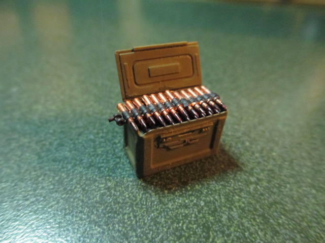 Tonight after work was antenna and stowage night. I got a goodly deal of it built including ammo cans and a big crate full of something ( vino maybe? ) The resin ammo links were harder to heat and bend correctly than I had anticipated but at the end, I had an open box of .50 cal rounds to set next to the BMG. Pics: