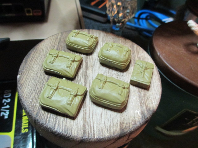 Carl! I think I'll have to build Joe a back story one of these days. The General always assumed it was women and strong drink that gave Joe his horrific expression. I don't know. Time will tell. Tonight was another evening spent with stowage. Some personal items and lots of ammo cans. I have enough packs for a crew and now I need to add strapping and weather them More as I discover spares or find items out and about. Pics: