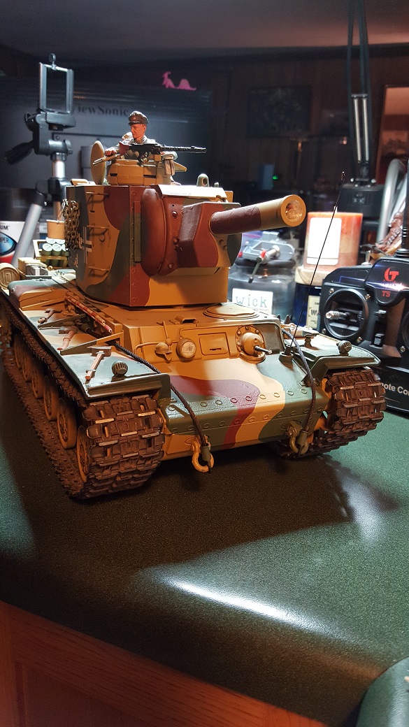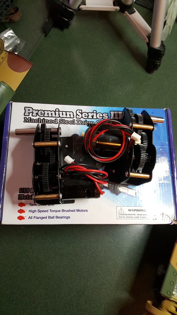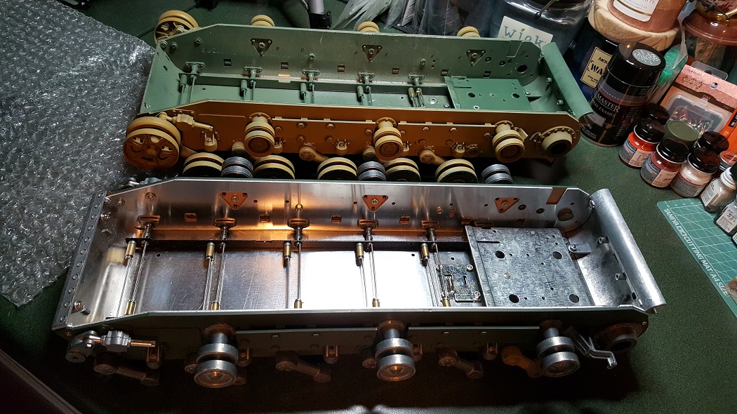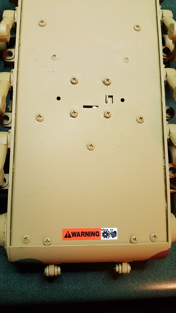 Four years on, I ran the 'Palace' out in the North Africa section of the lot to do a photo shoot for a past Tank of the Month. Some great pics resulted but later during the cleanup ( dusting grit out of the tracks, etc ) I noticed a clicking noise while the tracks were running and the drivers side track seemed slower to respond. I knew that there is no slipper clutch in a metal gearbox so I opened it up and sure enough, the zinc cast gear box was kaput on that side. The great weight of this tank had finally worn away the teeth on the gears. The other side was not in much better health. Time for a Redo! A couple of months of collecting the right gearboxes ( had to order from Russian Federation since Taigen was out in the states ). Kindly assistance from Forgebear netted a brand new lower hull and return rollers. ( again, Taigen was out of stock ). Lower hull, you might ask? Well in the tear down, I noticed that the front of the lower hull was bowing out a bit ( from what I could not speculate ) and I went to tap it back into shape with a small brass hammer resulting in shattering the add on armor plate on the bow!!!! This included the 'L' shaped lip that keeps the upper in place. So after rueful searching later, months of waiting ensued. I had epoxied everything back together but I could not reach a point in the process where I was satisfied. So a serious Re-Do resulted. At the conclusion, the 'Palace' rides again, better than ever! Here are the pics: ( Click to enlarge as usual )
