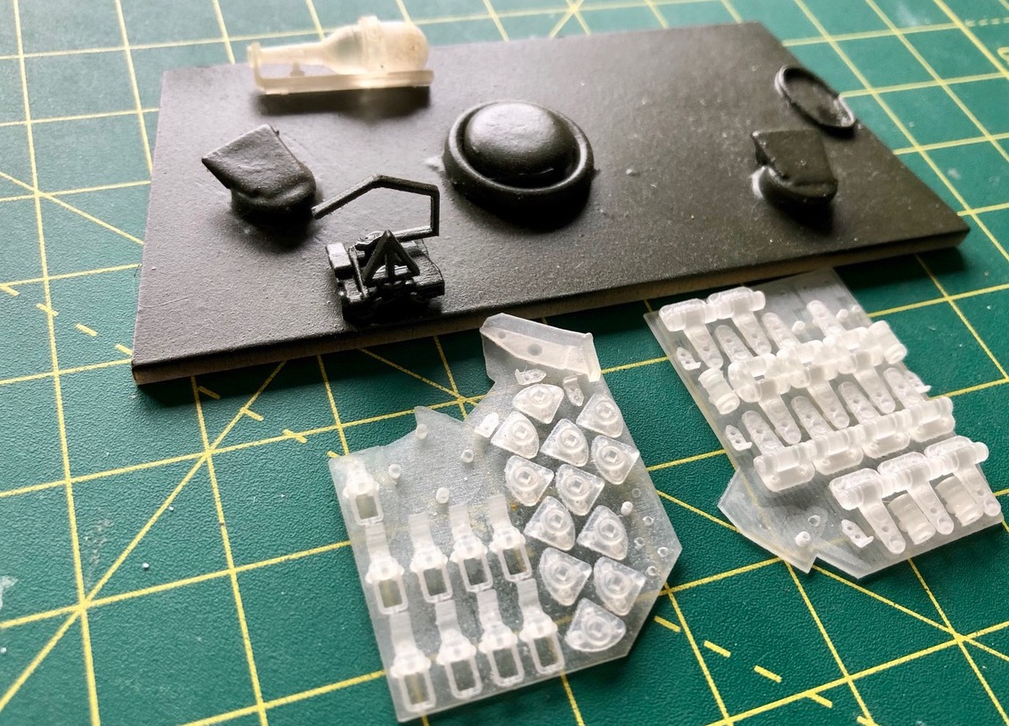 Meantime, I'm making an attachment bracket for the T34 Spotlamp, which will be used as an ersatz turret spotlamp on the Cromwell. There's no immediate way of bonding the lamp bracket to the turret wall, without making an angled support bracket.