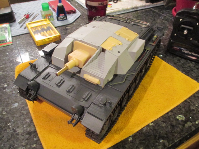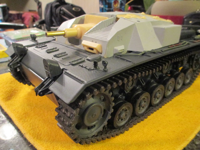 Sunday was BBQ day so I spent all afternoon in front of a hot grill and the evening cleaning up after Guests had left. Today was StuG day and I was determined to get the main gun mounted and working. After a walk the dogs session and a visit to the gym and breakfast, I got busy. It was immediately apparent that the barrel clamp and the elevation trunnion were still too long. I ended up removing material from both ends of the clamp and one side of the trunnion to give the gun barrel enough space to recoil freely. Elevation works but is minimal. It's an early Assault Gun graced with a honking great flanged mantlet so not terribly bothered by that. At least it works. The real heart breaker today came after I realized that if I drilled out all of the material required from the bore of the lovely little aluminum gun barrel for the flash to fit, the walls of the barrel would be almost paper thin. I sat the barrel aside after one drill session and cut a replacement in 1\4 inch brass tubing. I will have to add a muzzle crown with a small washer but at least there is room for the flash now. The mounts were made out of left over plastic from the original idler mounts and super glue gel and double stick tape. Weird but solid. I ended up padding the gun mounts 1/16 of an inch after that to get free play on the exterior. I was very glad that I had cut the steel pins for the mantlet a little long. It's all together and it works. Tomorrow or Wednesday, I will fix the barrel crown detail and glue the xenon flash into place. Pictures: