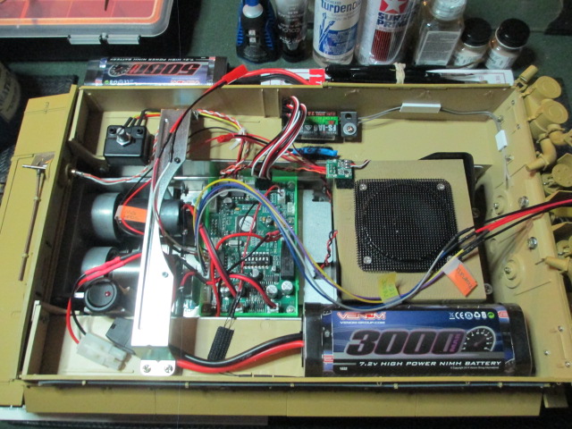 The right tools make all the difference in the world between fun and drudgery. This is a lesson I seem to have to keep relearning as time goes by. The new Dremel is a Jewel among Butane Torches. If you ever have the chance to nab one on sale, do so. I took the first free afternoon in a couple of days to work on the Tiger again. Tonight was more electrics including the Sound Pot, the Receiver and adjusting the On\Off-Battery wiring. All three pieces are mounted and should work nicely. Tomorrow, I hope to be able to work with the lights and MGs. Pics: