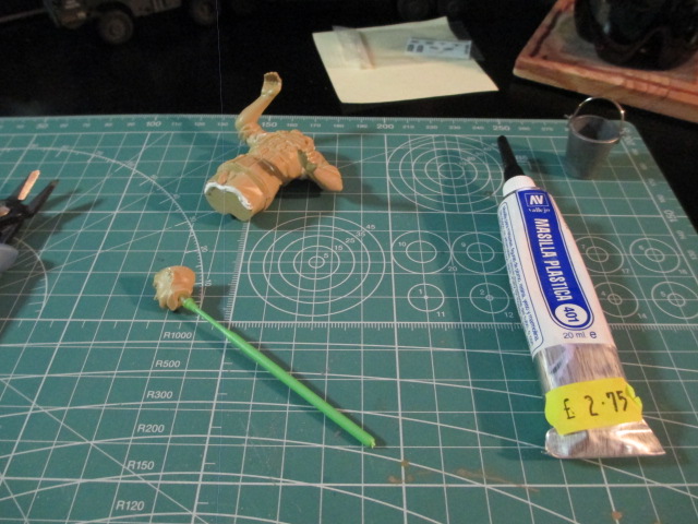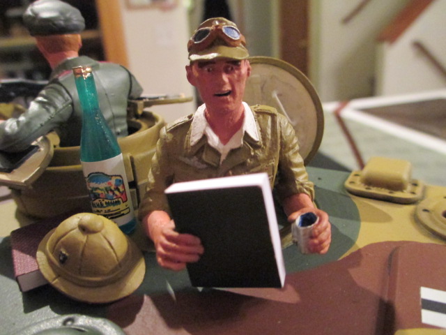 Sat down last night and began the work of assembling and painting the Commander. This kit gave two options and I went for the Tropical Uniform fellow. I had purchased specific skin and shadow tone paints for this but after a couple of attempts with the chalky skin tone, gave it up as a bad effort. I went with the combos of wood ( don't laugh too much ) and sand that had given such good results on the crew for the 'Palace' and the early StuG. He looks properly horrific with his head hanging off of a stick today but he will clean up nicely for this Tiger, I think. Pics: