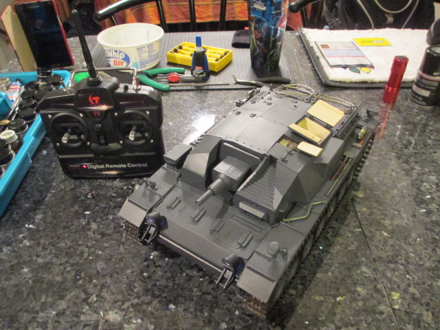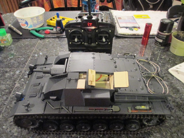 Hello! The purpose of this build was to make a working 1/16 scale version of Tamiya's excellent 1/35 scale StuG III B. I received a partially built Tamiya StuG last year and upon finishing the kit, was really taken with the vehicle. So one Profiline resin kit and a Taigen Pz III and a bucket full of detail and parts later, I'm almost finished with the RC version of the StuG. The color will be the Panzer Grau that I have finished it in, weathered to match the 1/35 scale version. Picture: