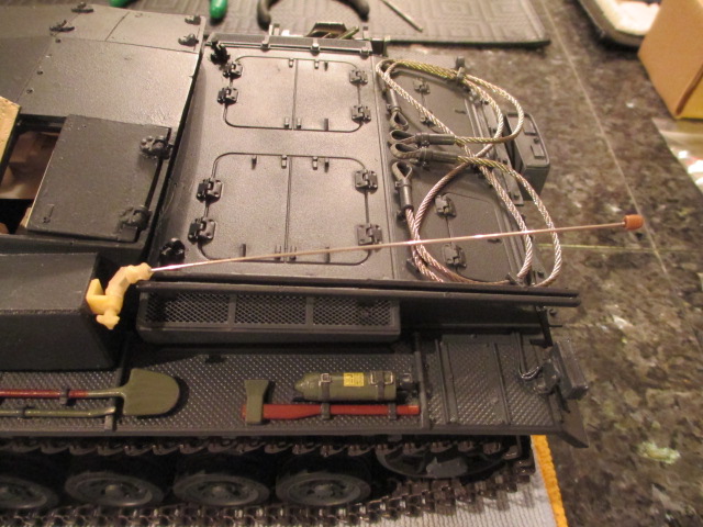 Alpha, thank you. I felt well enough last night to pick up work on the StuG. I wanted to get some of the last of the resin kit on it so I could switch to spending time on the special features I have lined up for the Gun. The resin is of good quality and takes paint well. The forming of the small pieces could use a little more work but with some patience and the yankee drill, I was able to make the antenna mount workable along with the cleaning rod mount. The pieces of the cleaning rod set came bent and it took some work to get them sanded and cleaned up enough to be usable. Even tho' I could, I don't think I'm going to be taking the rods out of that mount anytime soon. ;o) The StuG books were instrumental again in getting the configuration right. Pictures: