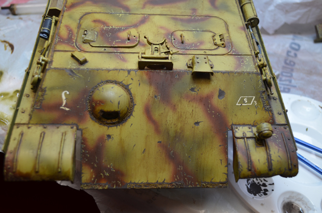 Hi Jeff. The paints are all Vallejo acrylics. The brush is a 00 size I used Model Air 71.025 Dark Yellow as the base colour and also I used it for the chips on the green and brown. Once that was done I used Model Color 150 - German Cam Black Brown for the rest of the chipping. Vallejo do an excellent DVD called AFV Acrylic Techniques for painting tanks if thats of any help.