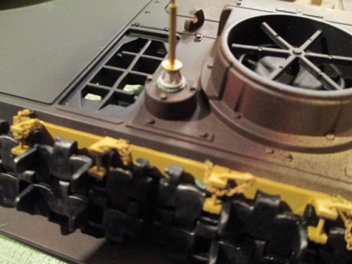 (This post would have gone up last night but power was lost due to the flooding we are still experiencing here in CO.) 16th Day work involved adding the small fuel knob that the fuel overflow line connects to. After that, I took up the grill vents I had sprayed medium green and mounted them. Far too light in comparison to the Green Black that most of the rest of the deck was sprayed in. Using a dry brush, I used Green Black and Hull Red and Dunkelgelb in acrylic and added the camo pattern to the vents. Much better looking! I went ahead then and added the hammer after painting it, (I'll try to add one pioneer tool a night.) and touched up the rest of the additions and fixtures on the rear deck that had been added so far. More fun today *chuckles*