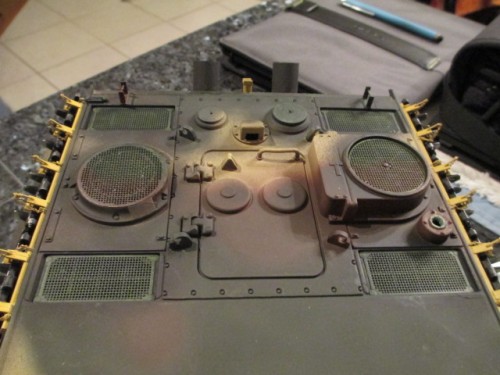 15th Day work involved ordering the fan housing lift hooks from Welsh Dragon. Still no love for the track slack rollers. Last night's Extinguisher was mounted then I took the time to correct the direction of the lift hooks already in place on the deck. The hook mounts broke midway out of the holes (as usual) so I drilled them out and used the stubs left over to reglue them with. Afterwards, I looked at the open vent housing in the back\middle of the deck and remembering another trick from the Forum, cut a neat square of window screen from a roll I had out in the Garage and glued it in place under the deck. I'll cut some flat brass or plastic to make the external vent bars that I have seen on these, another evening. Next, I cut and drilled out the plastic antenna mount and test fitted the neat Schumo antenna that will go there in it's place. It won't have a working connection since, unlike the Tiger B I put one of these on last time, this tank is 2.4 GHz. Seeing an opportunity, I attempted to dry brush the other vent screens that go on the fan housings and the deck with green-black. No luck there, too patchy. I sprayed them a medium green instead and will add some dry brushed dunkelgelb tomorrow night before mounting them. The shutters I have coming for the right side grills will likely be painted green-black and hull red. Lastly, I measured and drilled to mount the metal tow cable mounts also from Schumo. That company is a real help! More fun tomorrow.