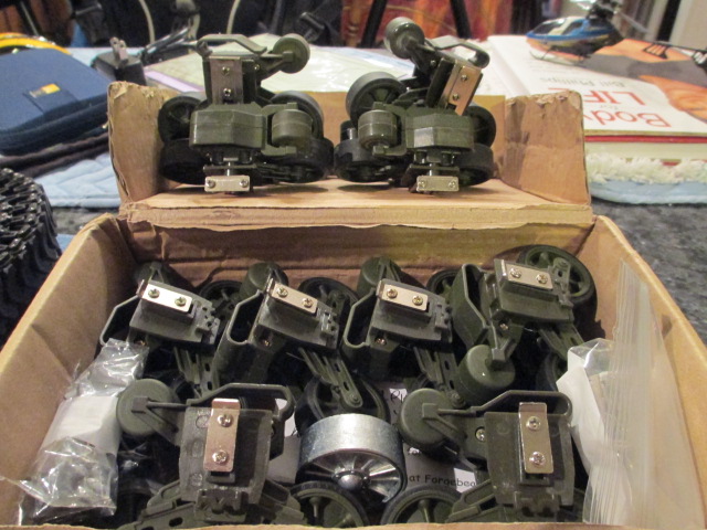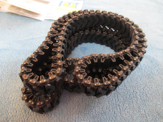 A parcel arrived from the UK and had some goodies in it for all of my American armor. The tracks are for the current build and the resin .50 cal ammo belts and cans will benefit 'Maxene', my HL Pershing and Taigen Walker. 'Maxene' is coming up on a mini redo here soon with some black steel gears and an idler mod I got the skinny on from Sassgrunt on the slate. I'll use this resin ammo and can to dress up her sweet Tamiya .50 cal at the same time. The Pershing will be getting a nice redo down the road which will include the black steel gears and this resin and one of the Tamiya .50 cals. ( I am really sold on those things ;o) and new paint. The Walker will get the same new gears and the new MG and details. The paint on it is from Taigen and excellent already. Tonight, I added a single link to the new tracks to bring them to 77 links apiece. I did this because the old tracks at 76 links were too tight and would have worn out the gearboxes with any serious use. I have new Mato running gear as well that was bought for 'Maxene' and not used. That along with these tracks will be a nice bit of kit to add to 'In The Mood'... Pictures:
